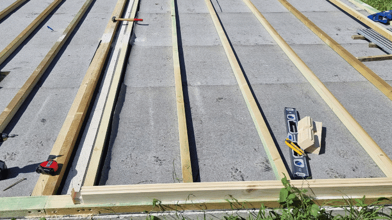 Zunächst müssen, um die Dachsparren in Stellung zu bringen, manchmal die Dachbinderabschnitte verstellt werden. Ihr Durchschneiden ist zu vermeiden! Im nächsten Schritt müssen die Dachbretter auf den Dachsparren festgenagelt werden. Die Bretter für richtigen Halt an allen Sparren befestigen. Wir empfehlen, sie für jede Dachplatte an mindestens DREI Stellen (oben, in der Mitte und unten) zu befestigen. Die Dachbretter dürfen nicht zu eng aneinandergelegt oder eingeklemmt werden, damit dem Holz etwas Raum zum Arbeiten bleibt.