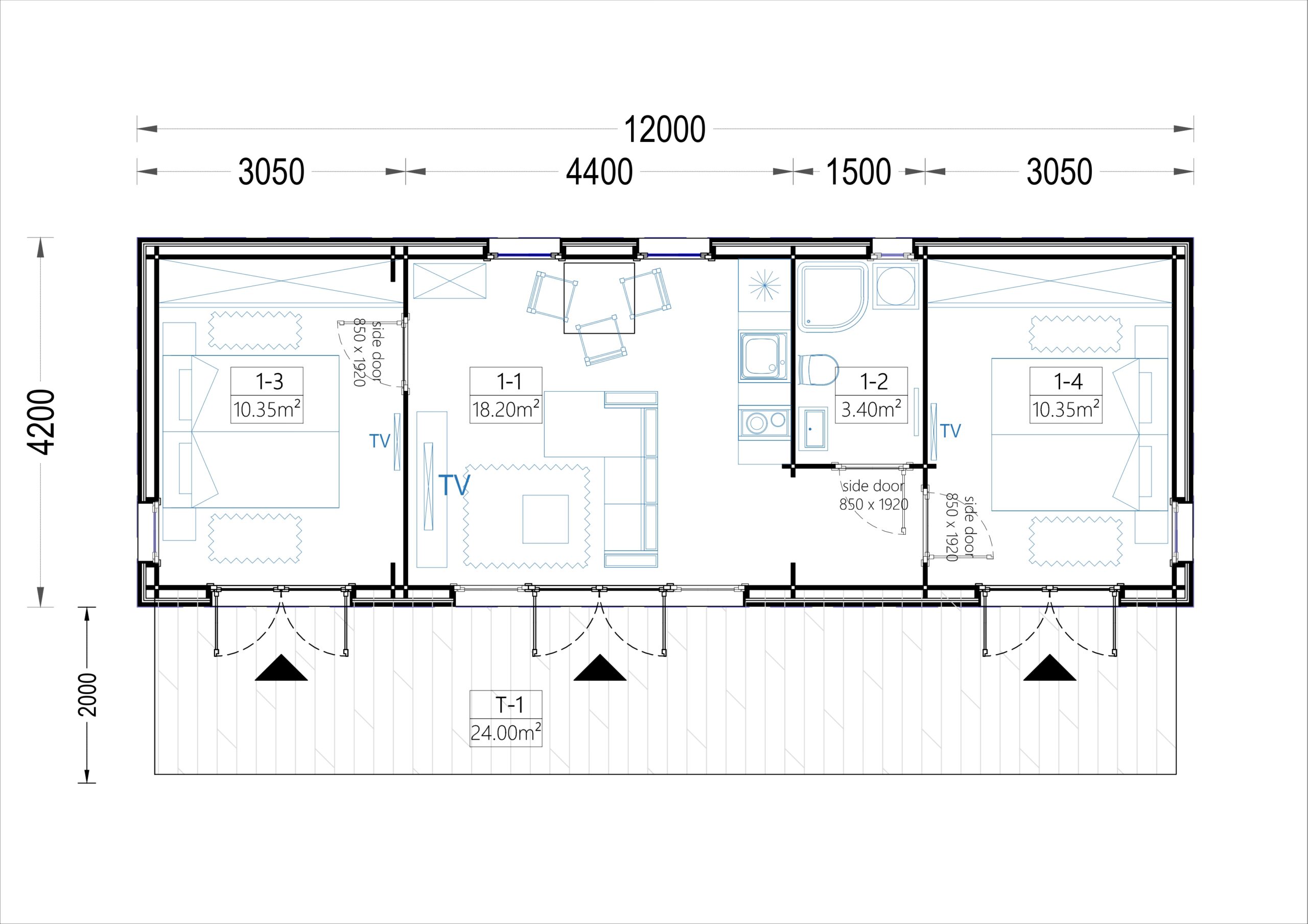 Eine 24m² große Terrasse, optional erhältlich, hebt das Konzept der Outdoor-Lounge auf eine völlig neue Ebene. Diese Fläche bietet Platz für Outdoor-Möbel, Grillabende und Entspannung im Freien.