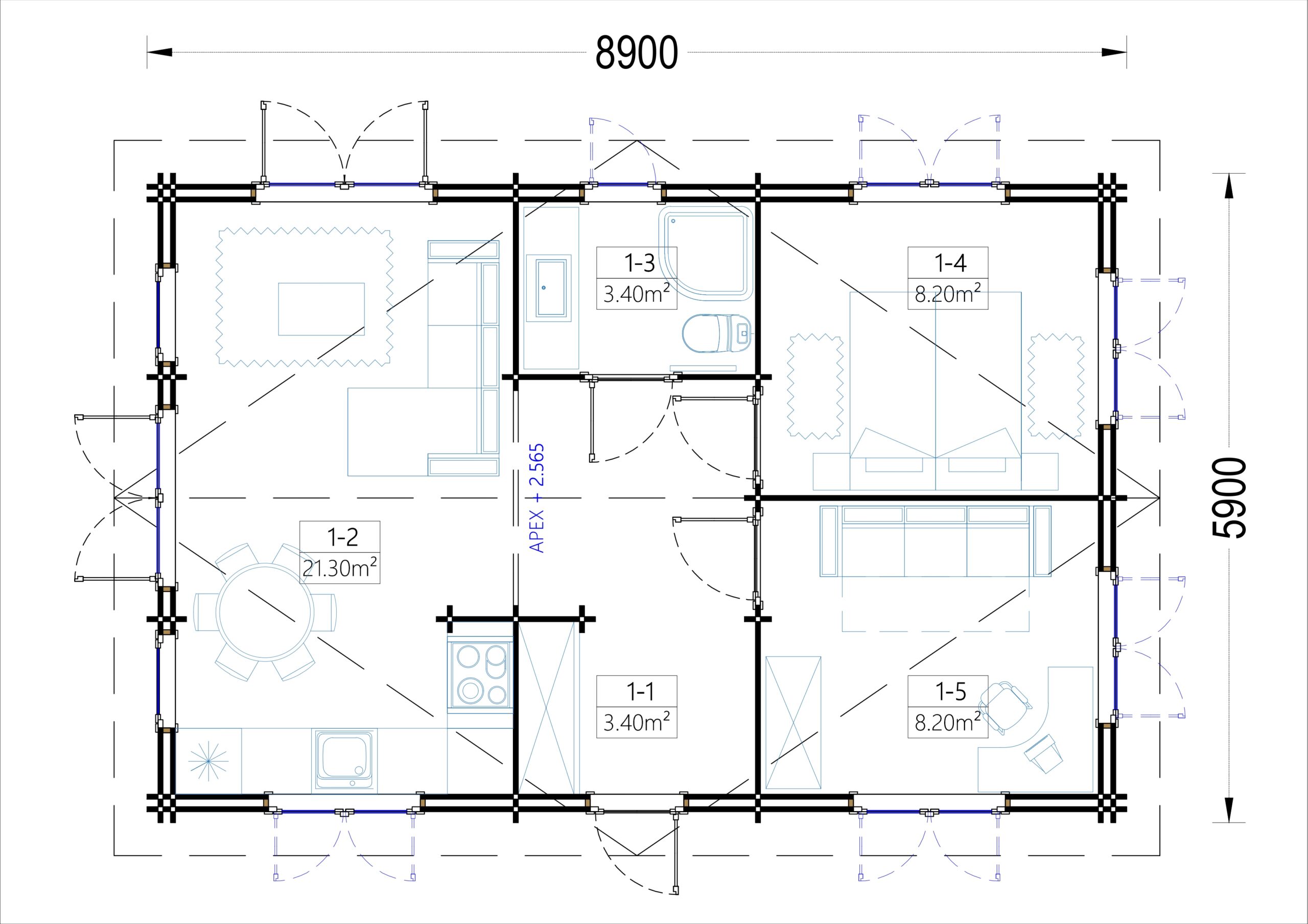 Blockbohlenhaus GRAZ (44 + 44 mm) 54 m²