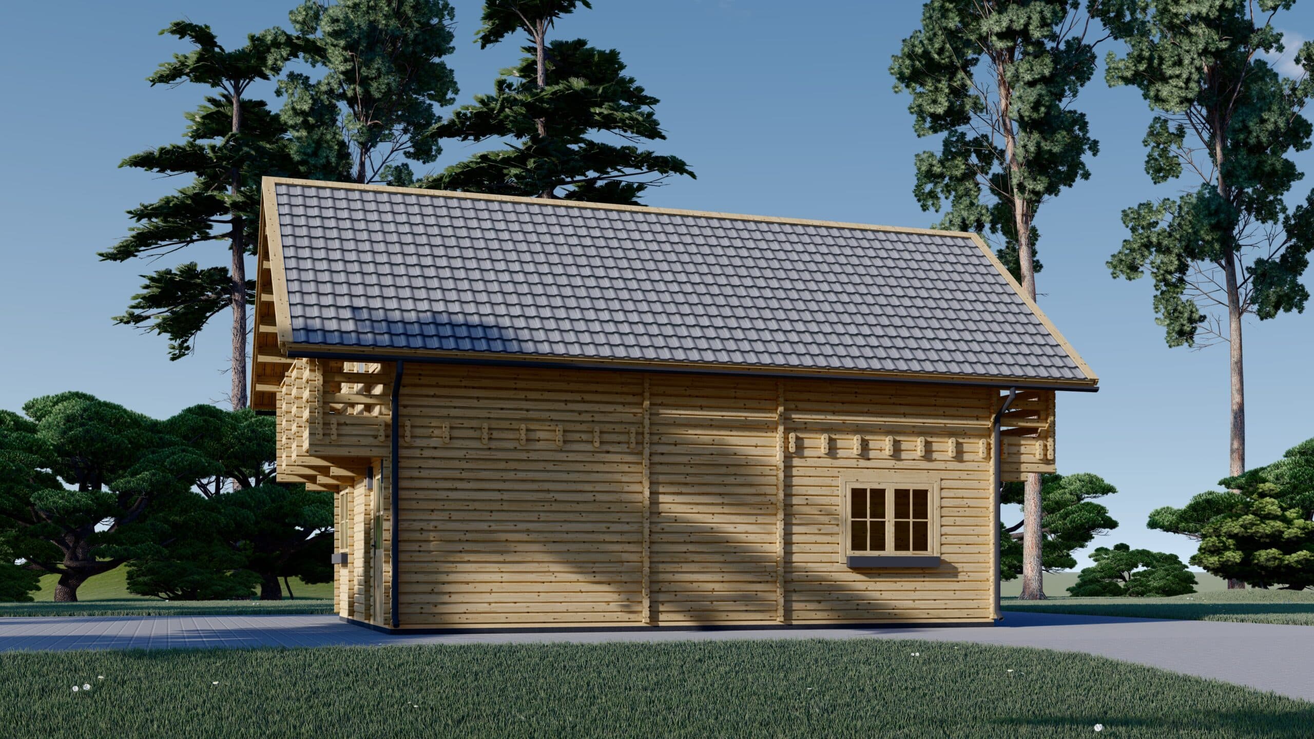 Spitzdach für eine klassische Optik: Das Spitzdach vervollständigt die gesamte Struktur und verleiht dem Blockbohlenhaus LISA eine großartige klassische Optik. Die ästhetische Gestaltung fügt sich harmonisch in unterschiedliche Umgebungen ein.