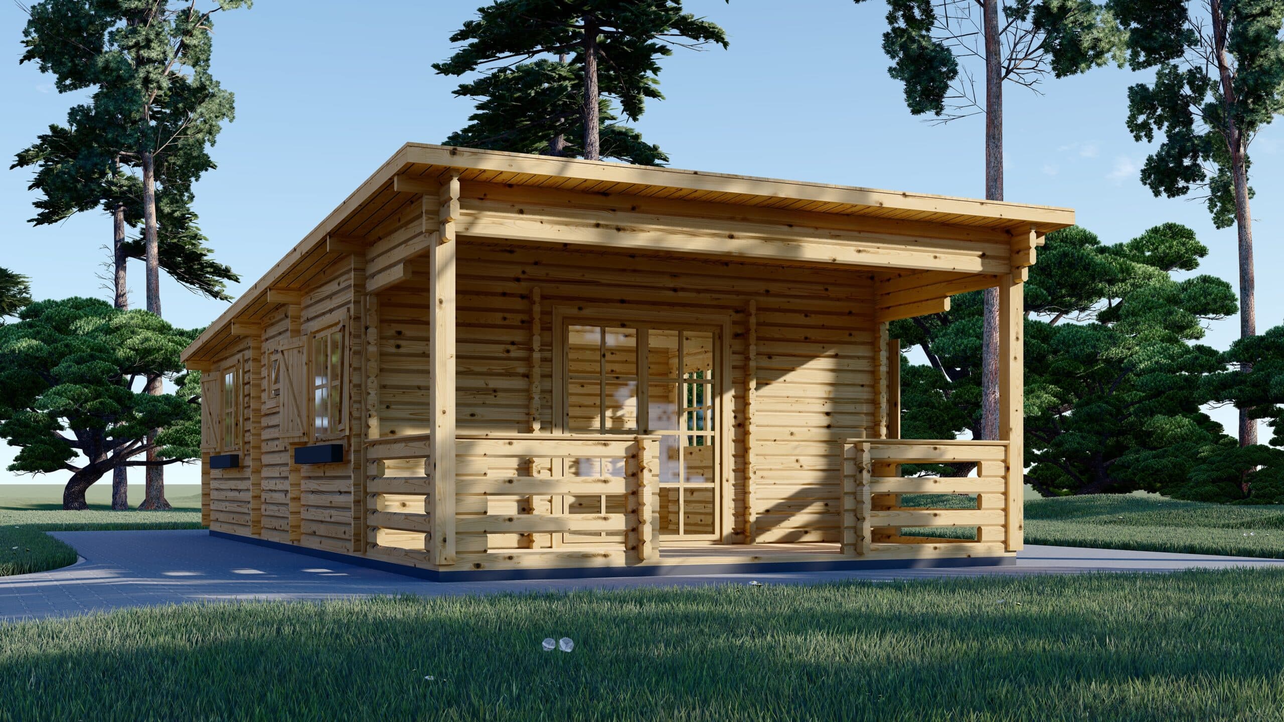 Blockbohlenhaus mit Flachdach und Terrasse HANNES (44+44 mm), 42 m² + 10 m²