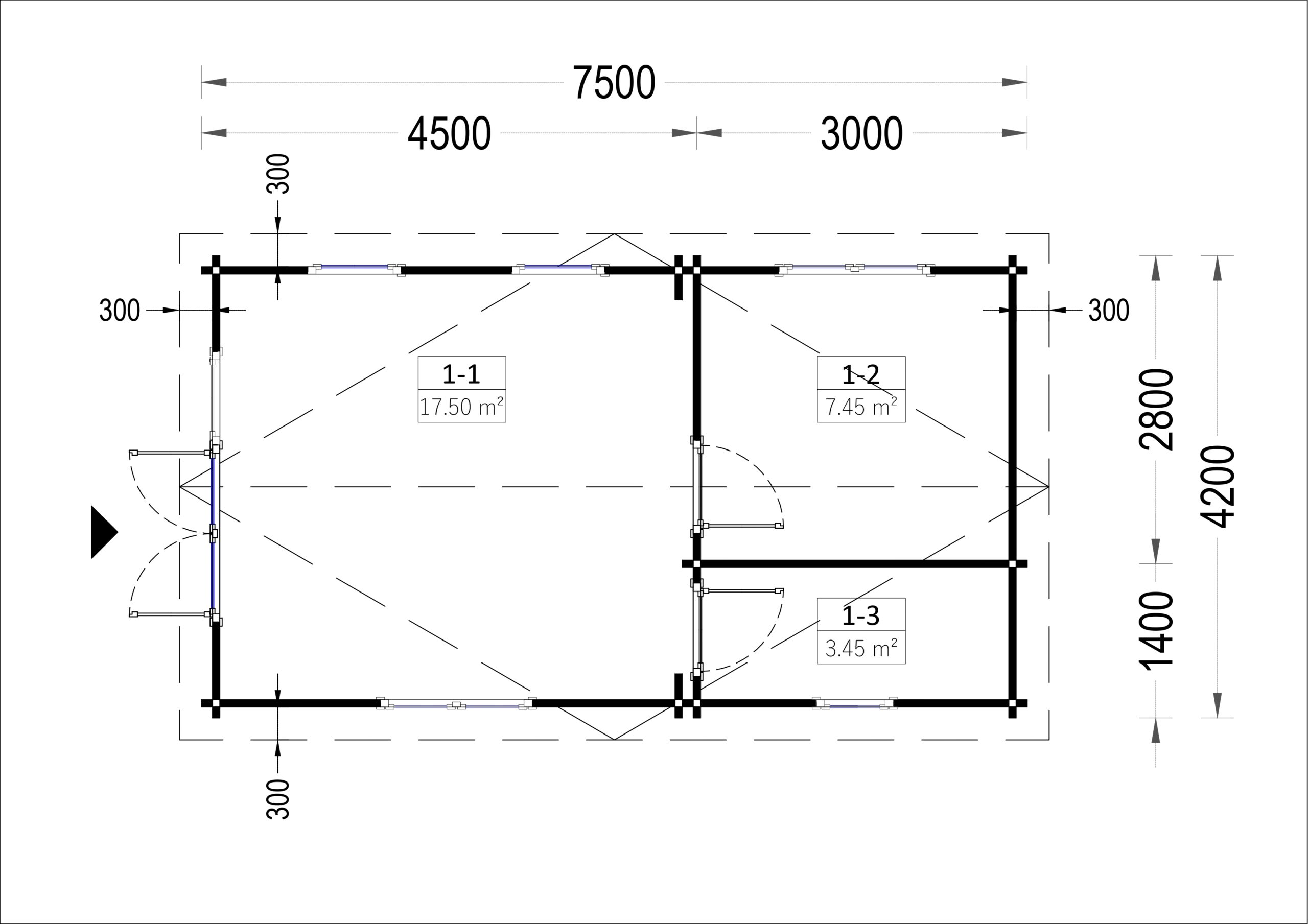 Das Blockbohlenhaus MORITZ von Premium Gartenhaus mit einer Wandstärke von (44 mm) und einer Grundfläche von 32 m² ist eine großzügige und gut durchdachte Option. Hier sind einige der Merkmale und Highlights dieses Modells: • Der Grundriss des Hauses ist in drei Bereiche unterteilt: der zentrale Wohnbereich, ein kleines zweites Zimmer und ein Badezimmer. • Dreifache Eingangstüren mit Kreuzfenstern verleihen dem architektonischen Design eine schöne klassische Note. • Viele Fenster und Türen sorgen für einen gemütlichen und lichtdurchfluteten Innenraum. • Stilvoller Dachüberstand, für einen angenehmen schattigen Bereich im Freien.