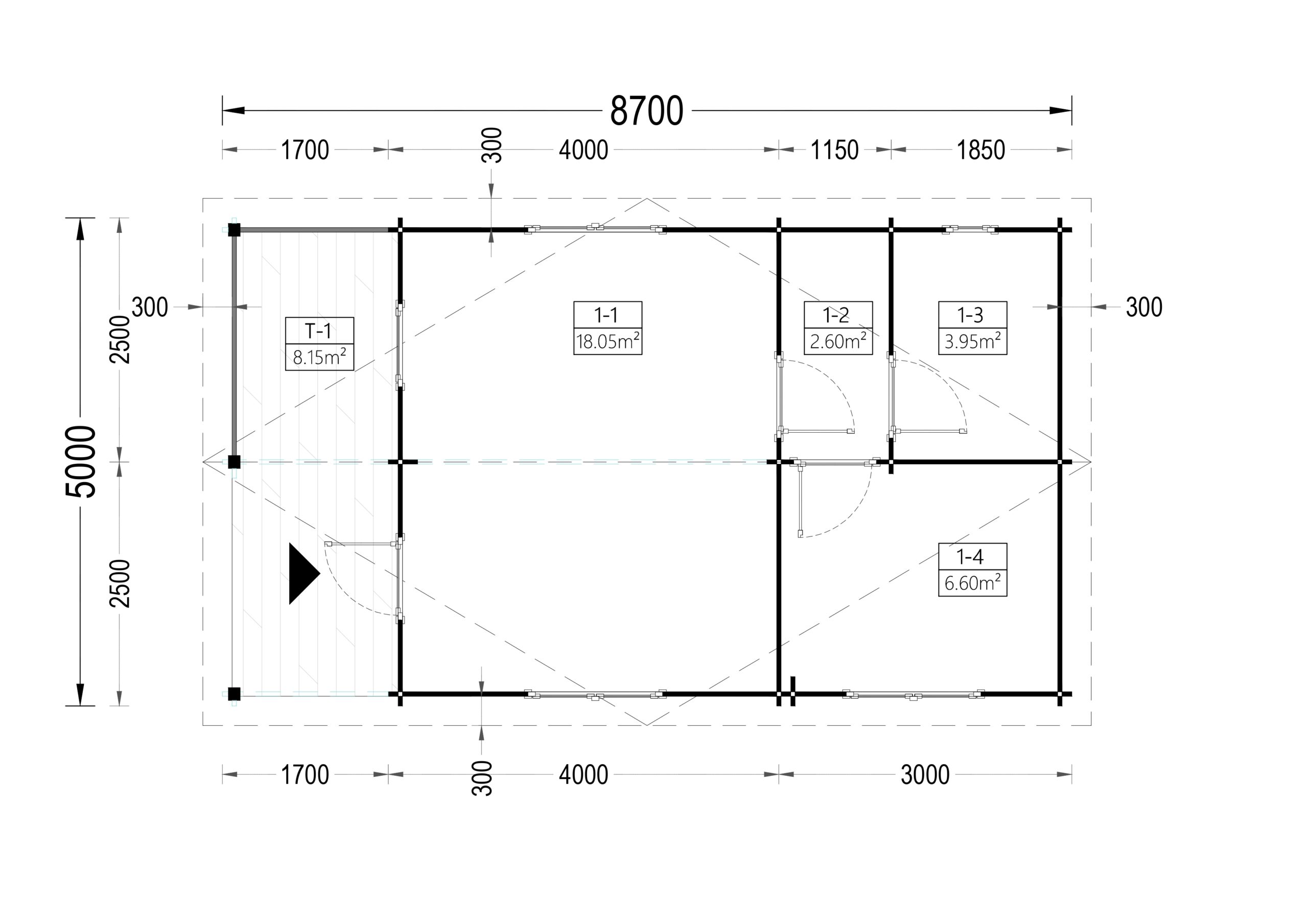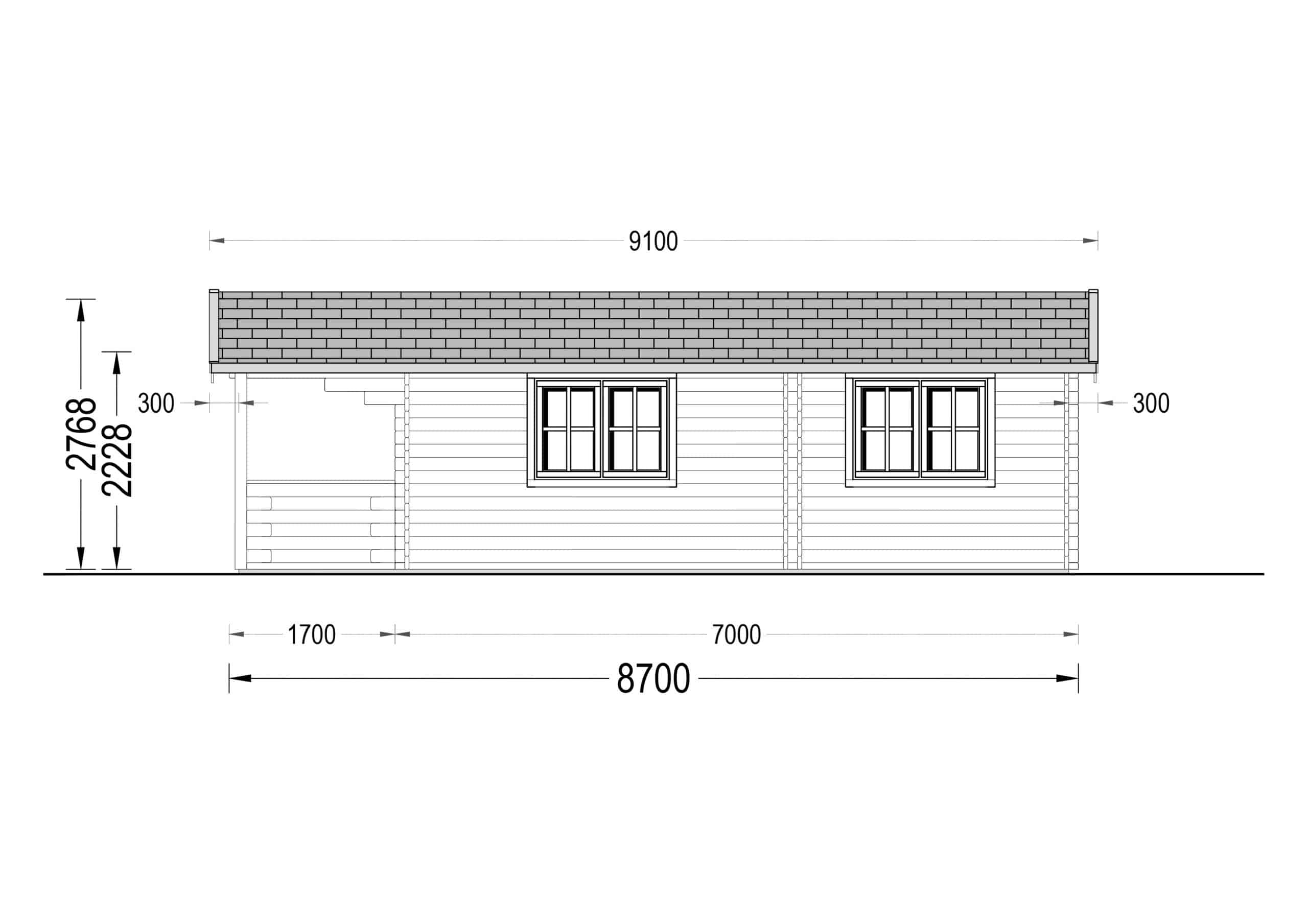 Blockbohlenhaus mit Terrasse ANTON, 5×9 m, 35 m² + 8m²