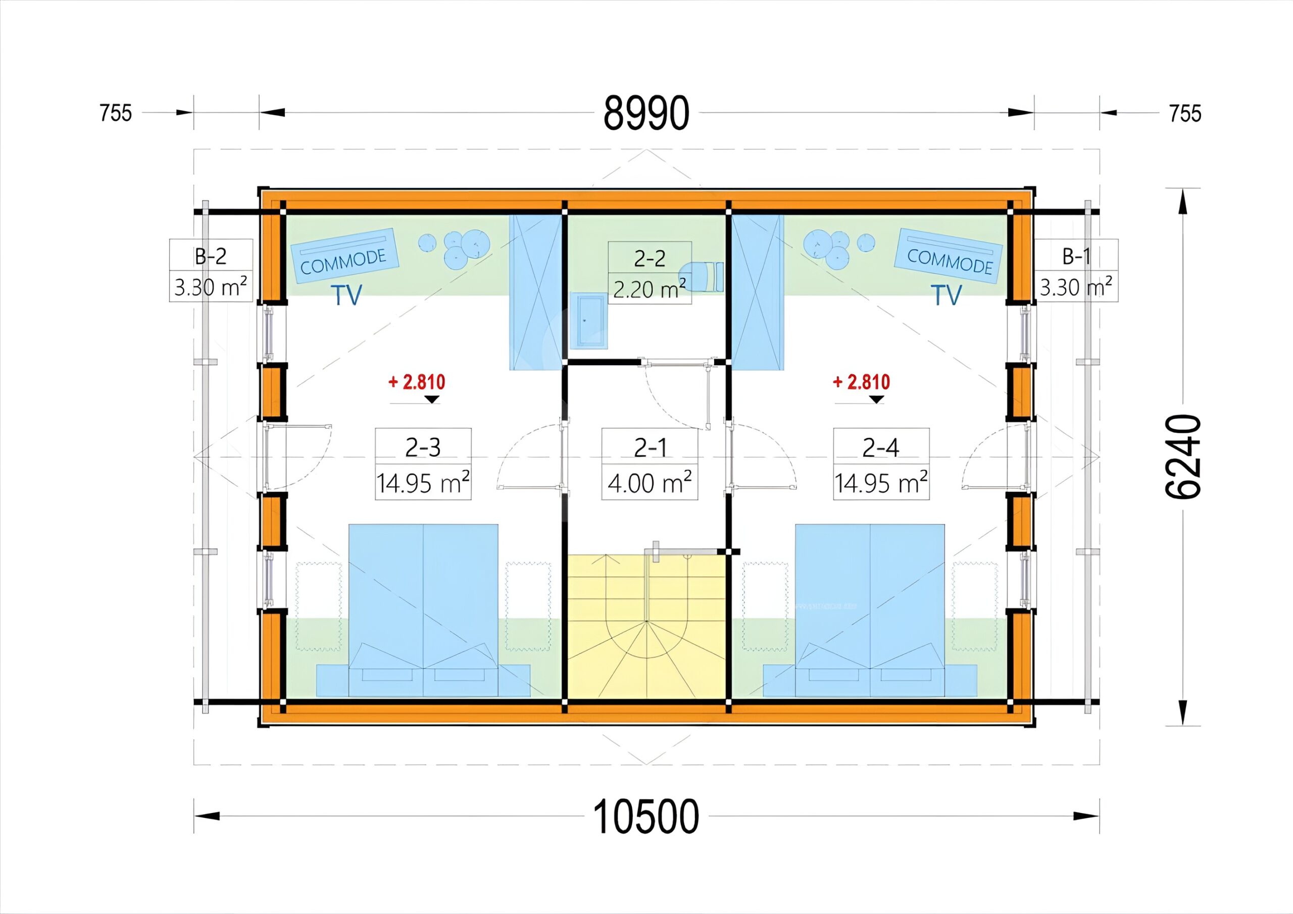 Das zweistöckige Holzhaus VERENA vereint außergewöhnliche Ästhetik mit einer durchdachten, praktischen Innenaufteilung, die sowohl Komfort als auch Privatsphäre für alle Bewohner und Gäste bietet. Die Highlights dieses Modells machen es besonders attraktiv: