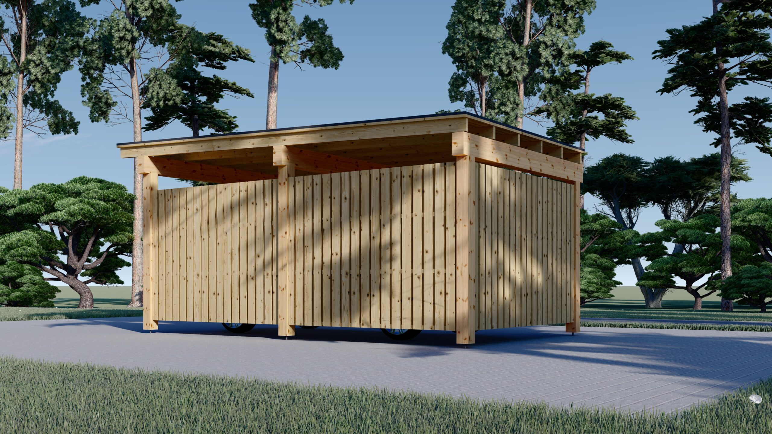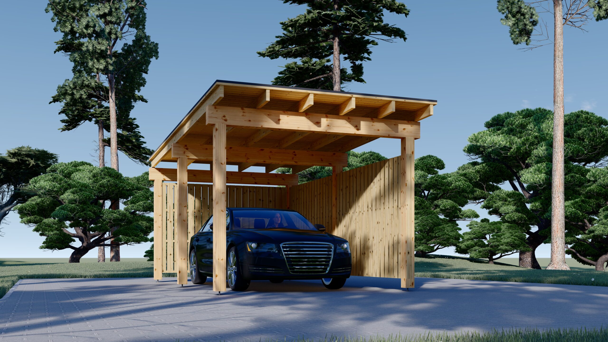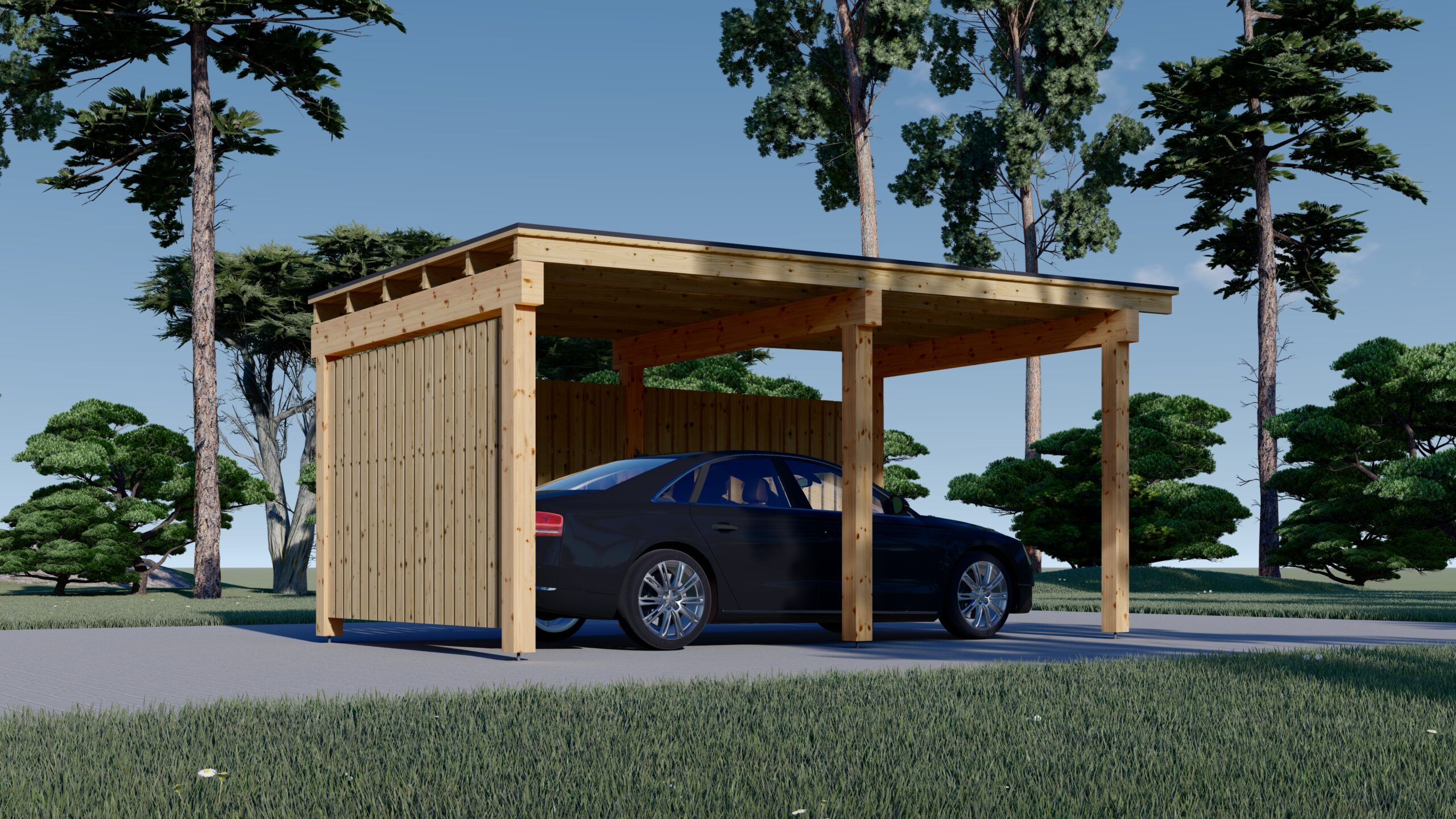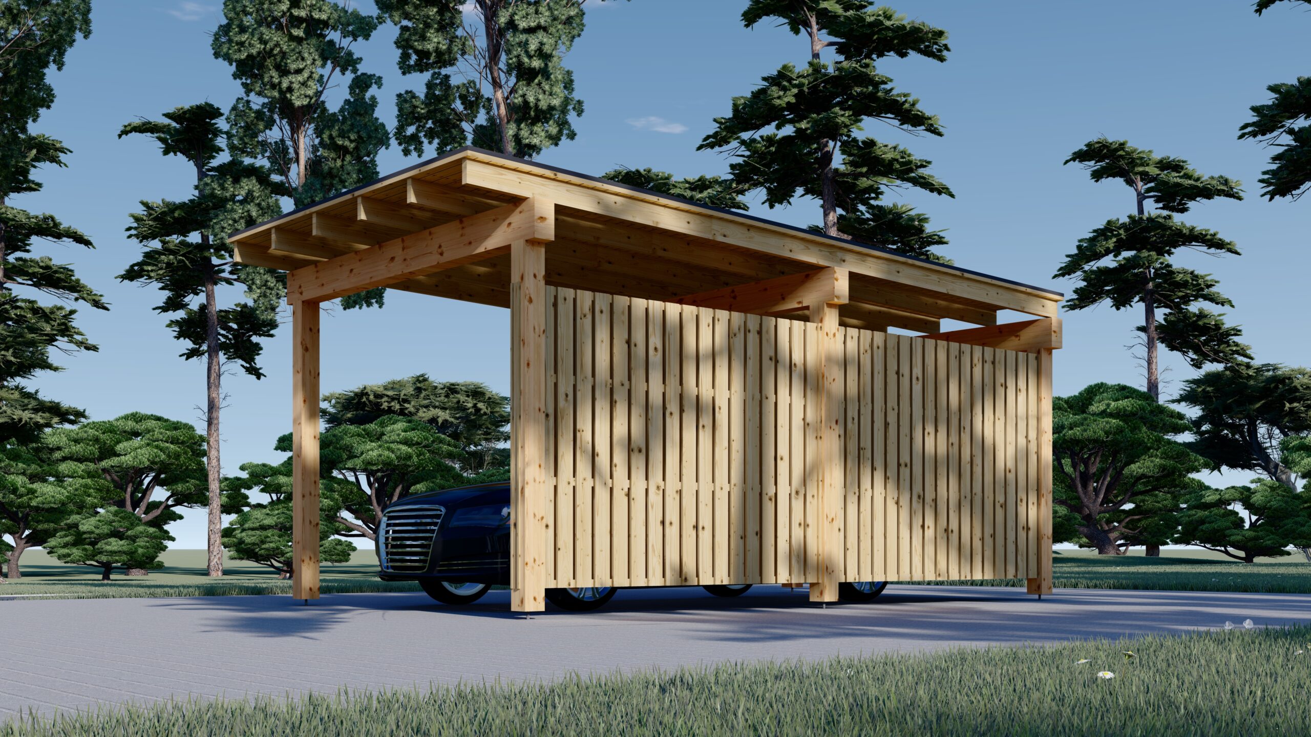 Dieses Carport-Modell umfasst 3 Seitenteile, die aus einem Holzrahmen mit einer vertikalen Lamellenverkleidung bestehen, und bietet einen hervorragenden Schutz für Ihr Fahrzeug. Die Carport-Konstruktion kann durch zusätzliche Paneele aus unserem Zubehörbereich problemlos modifiziert werden - wählen Sie einfach die Anzahl der Holzpaneele, die Sie an den Seiten Ihres Carports anbringen möchten