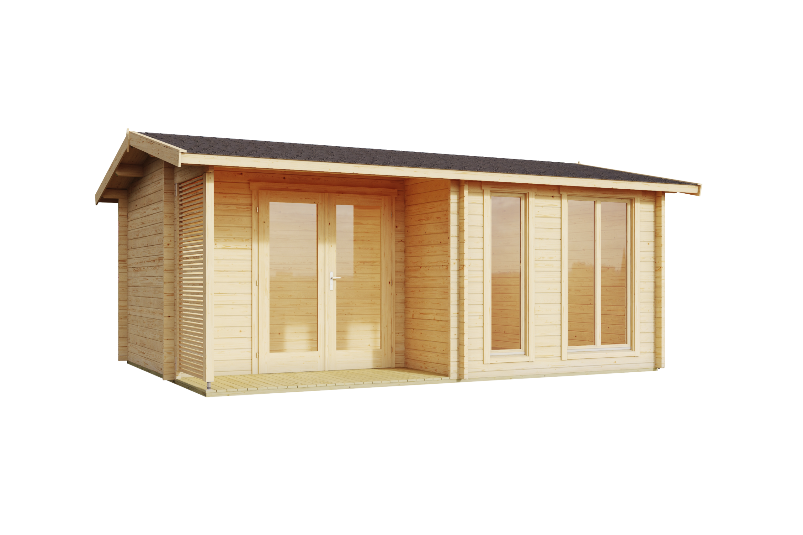 Brighton sehnt sich danach, Ihren Traum von der Wohlfühloase zu erfüllen. Das moderne Gartenhaus mit einer Fläche von 14,9 m2 und 70 mm Wandstärke begeistert mit seinem tollen Design und bietet Platz für Ihre Gestaltungsideen. Die breite Doppelflügeltür mit Lichtausschnitten und die bodentiefen Fenster bringen viel Licht ins Innere und sorgen für ein angenehmes Wohlempfinden und einen wunderbaren Ausblick hinaus in die Natur. Die inkludierte imprägnierte Terrasse garantiert noch dazu einen sauberen Auftritt auch vor dem Haus.