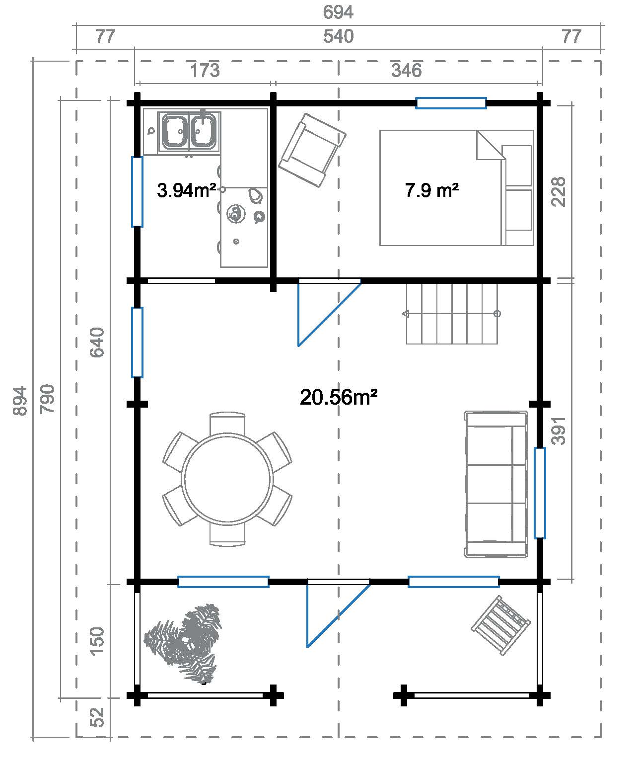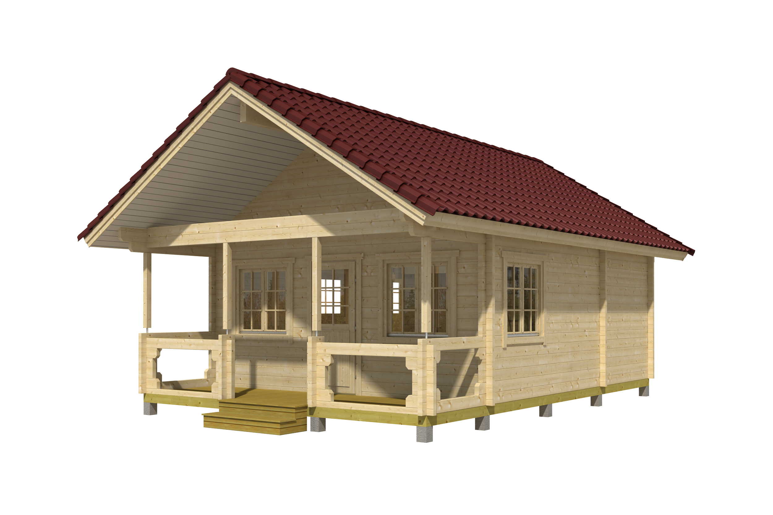 Ferienhaus mit Terrasse und Geländer 70 mm , Fundamentmass 5400×6400, Naturbelassen
