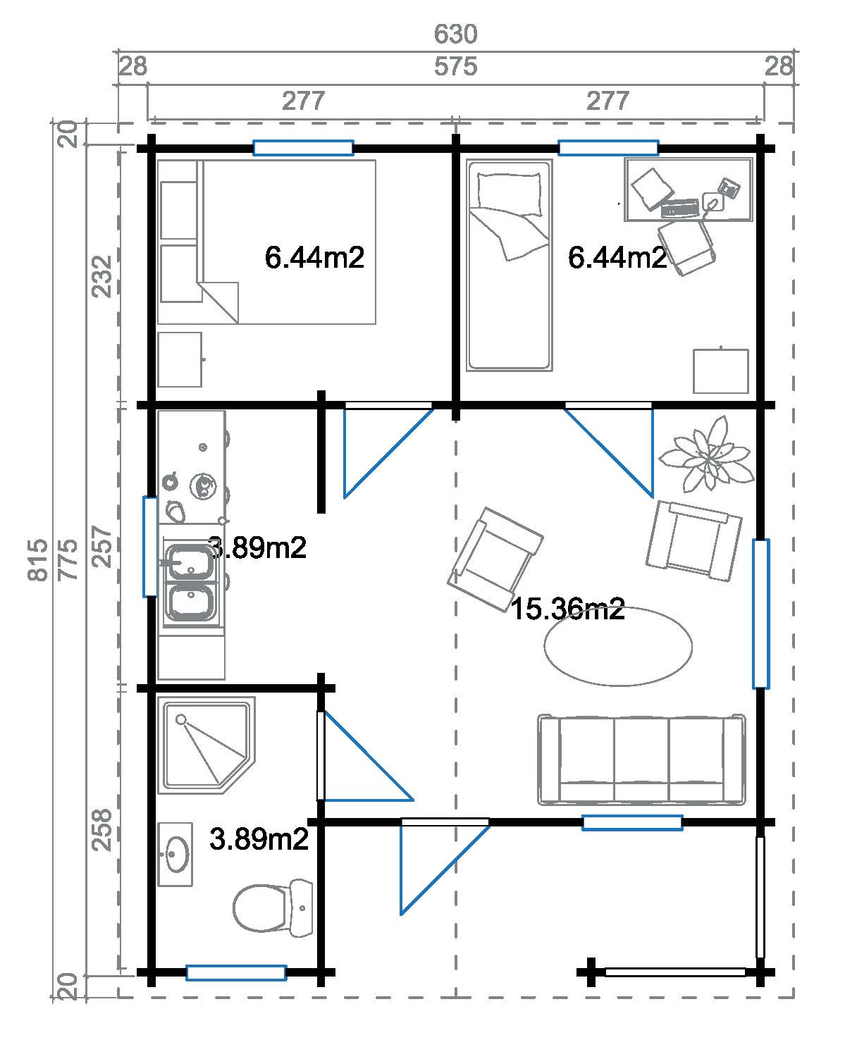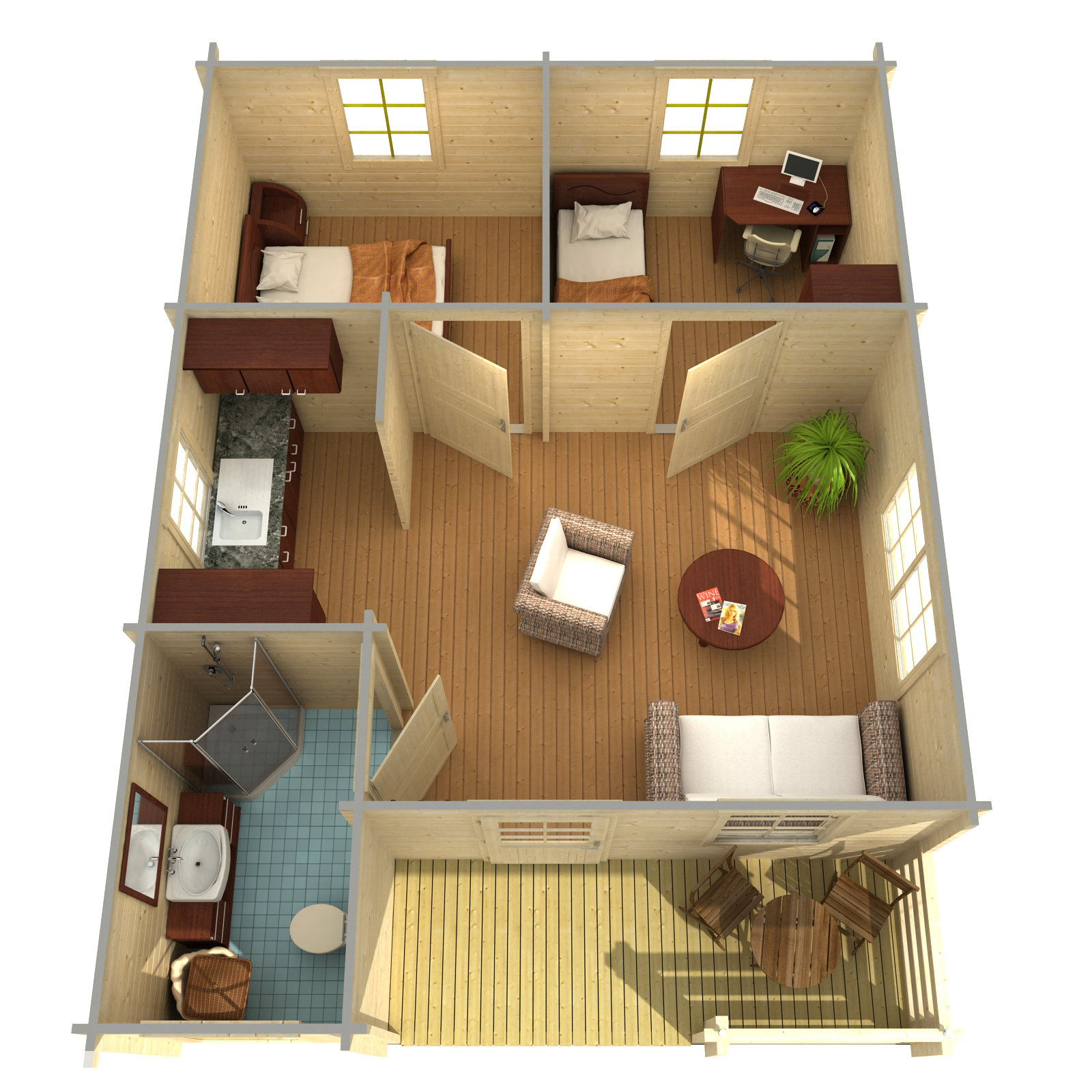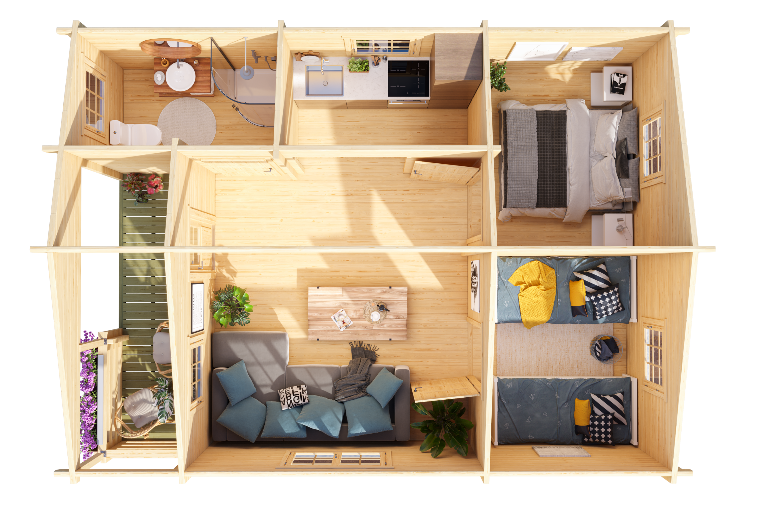 Auf 36,1 m2 lässt es sich herrlich entspannen und vom Alltag erholen. Fünf Räume sorgen für Ordnung und schaffen Privatsphäre für die ganze Familie. Die integrierten Fenster sorgen in jedem der Räume für ausreichend Tageslicht und lassen sich mittels 2-Hand-Dreh-Kippsystematik öffnen und schließen.