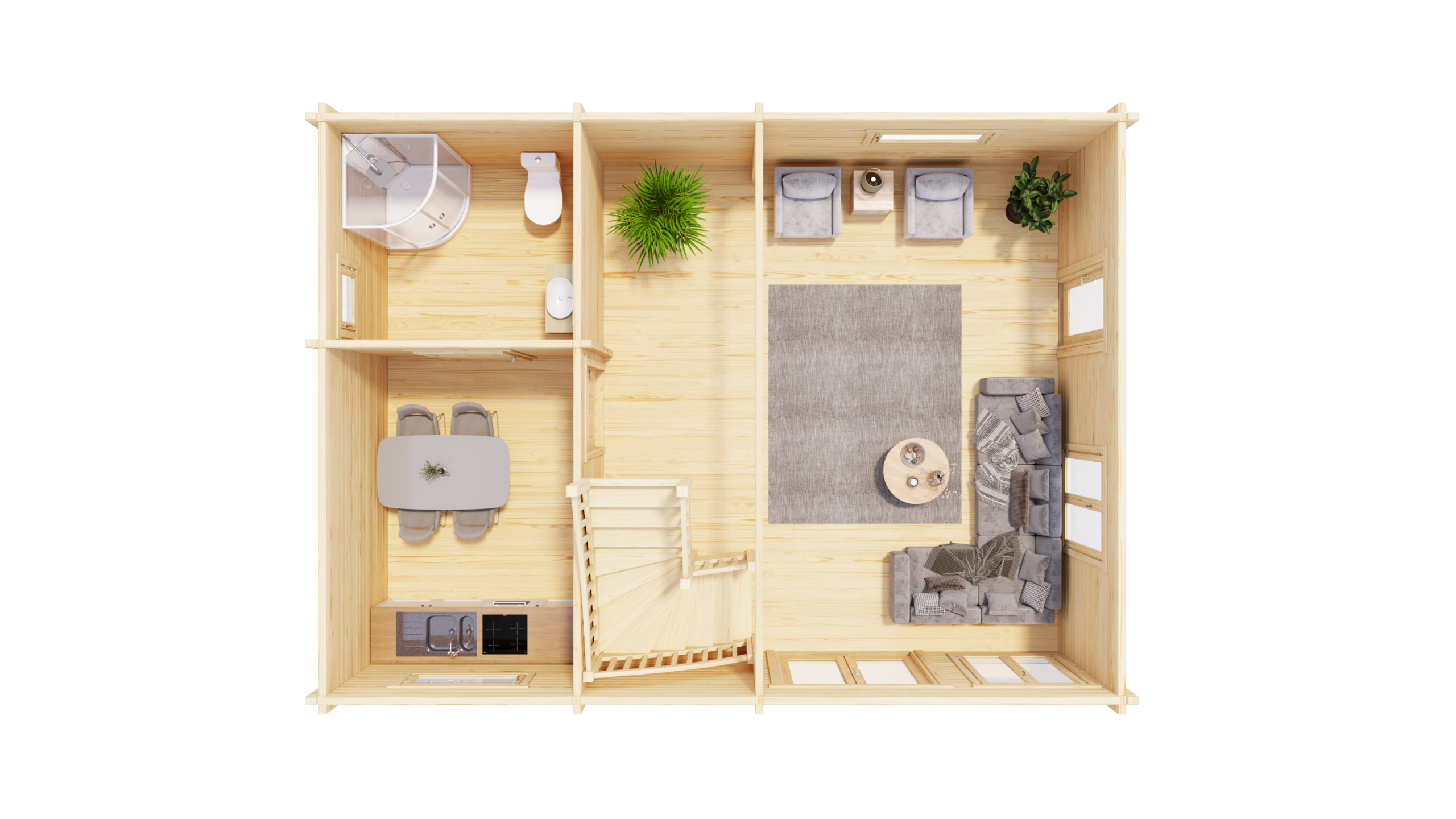 Das geräumige Ferienhaus Matterhorn ist die ideale Mischung aus Moderne und Harmonie. Hier vereinen sich hochwertig verarbeitete Elemente, massive Wandstärken von 92 mm und echte Premiumqualität für pure Gemütlichkeit und extra Komfort zum großen Ganzen. 65,3 m2 Wohnfläche bieten Platz für Familie, Freunde, Hobby und mehr. Eine integrierte Treppe führt in das obere Stockwerk mit zwei separaten Schlafräumen. Insgesamt neun Fenster sorgen für ordentlich Tageslicht in jedem der Räume und lassen sich mittels komfortabler 1-Hand-Dreh-Kippsystematik öffnen und schließen.