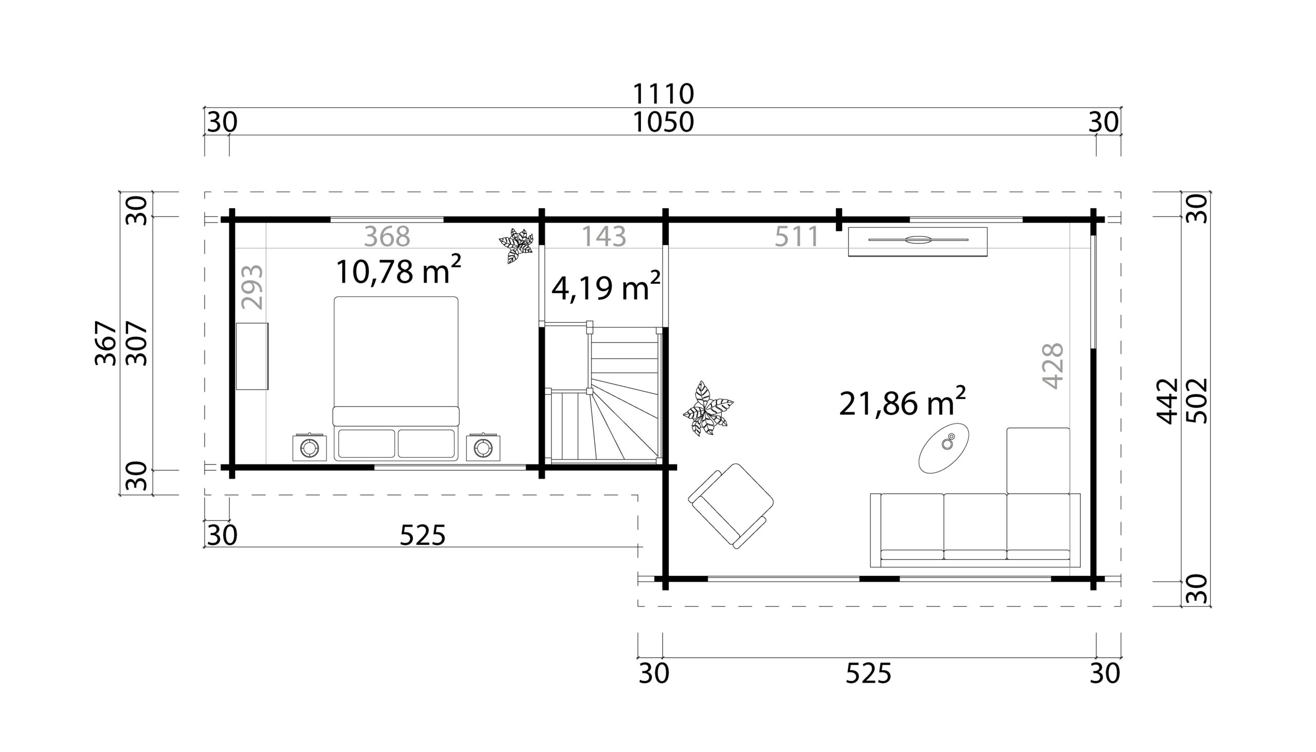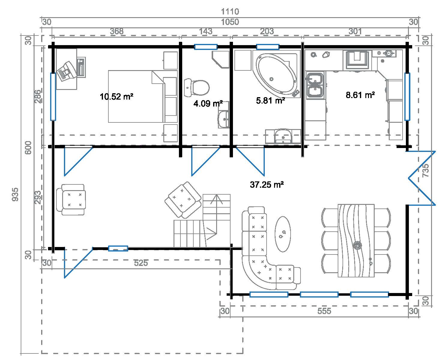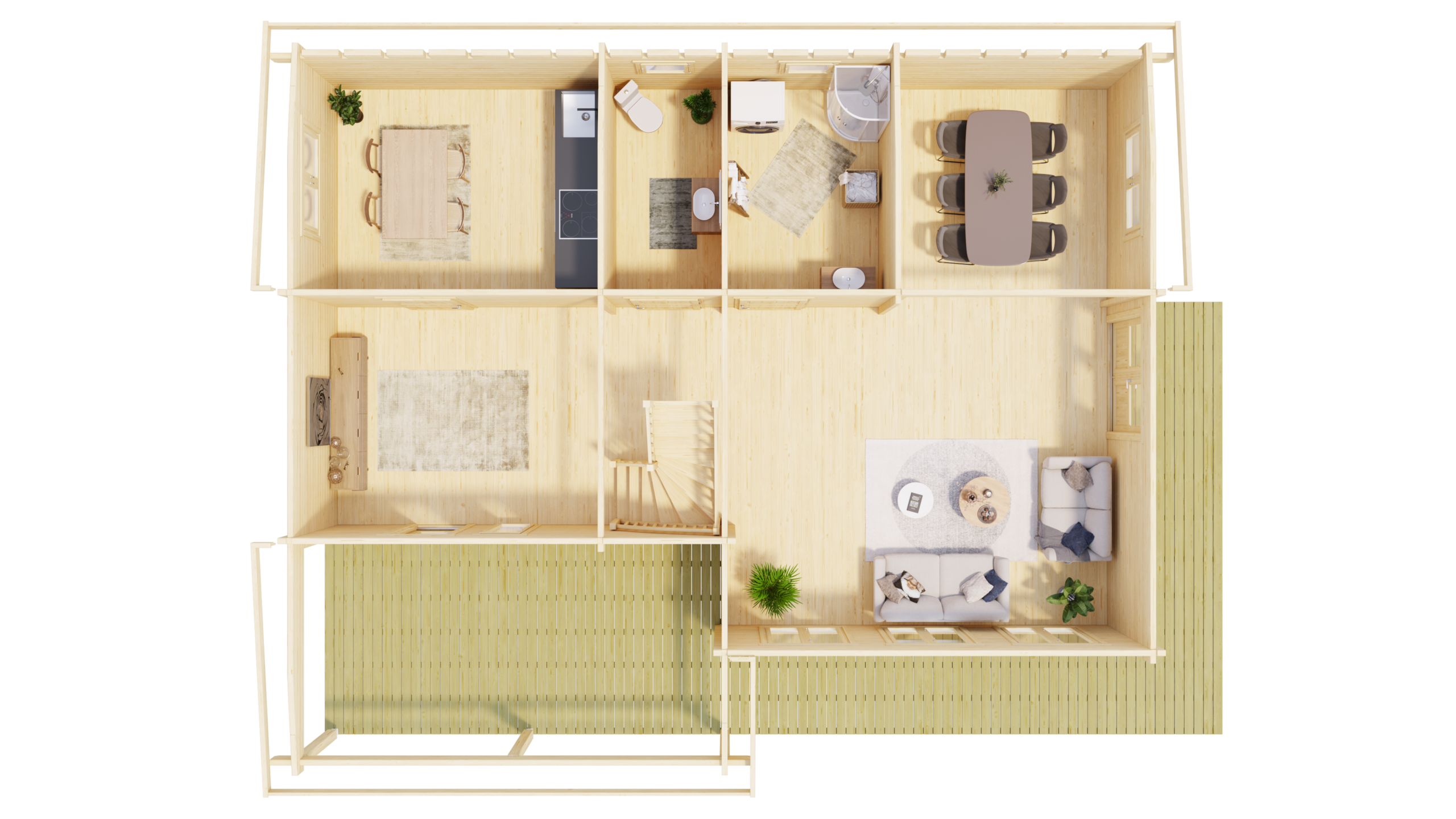 Ferienhaus mit überdachten Terrasse und 2 Etagen 70 mm, Fundamentmass 27350×10500, Naturbelassen