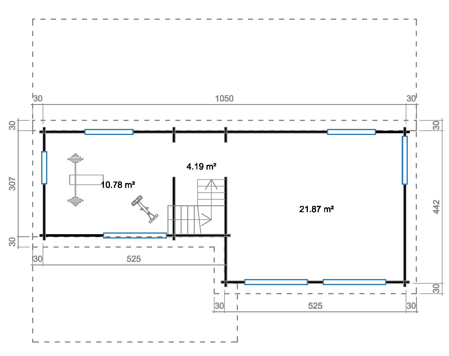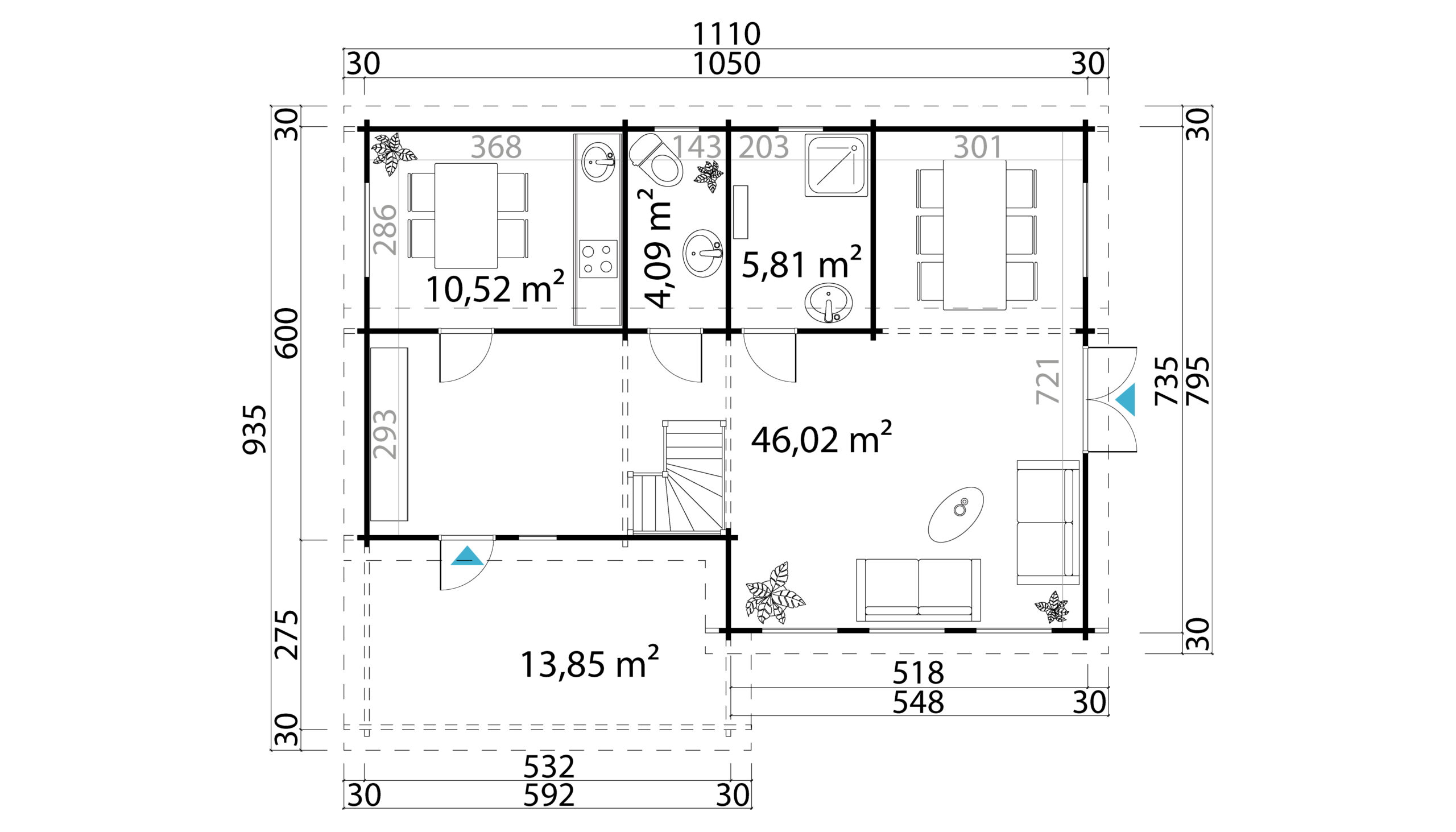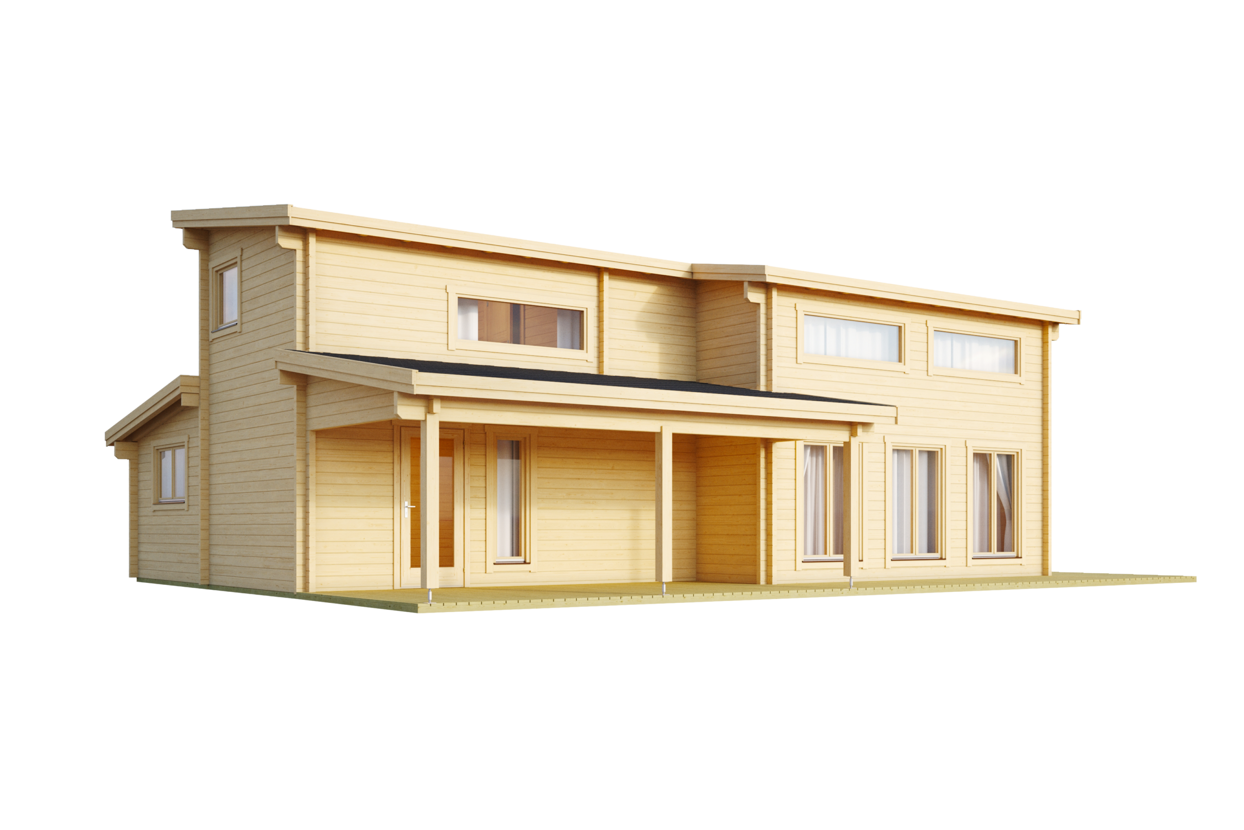Ferienhaus mit überdachten Terrasse und 2 Etagen 70 mm, Fundamentmass 27350×10500, Naturbelassen