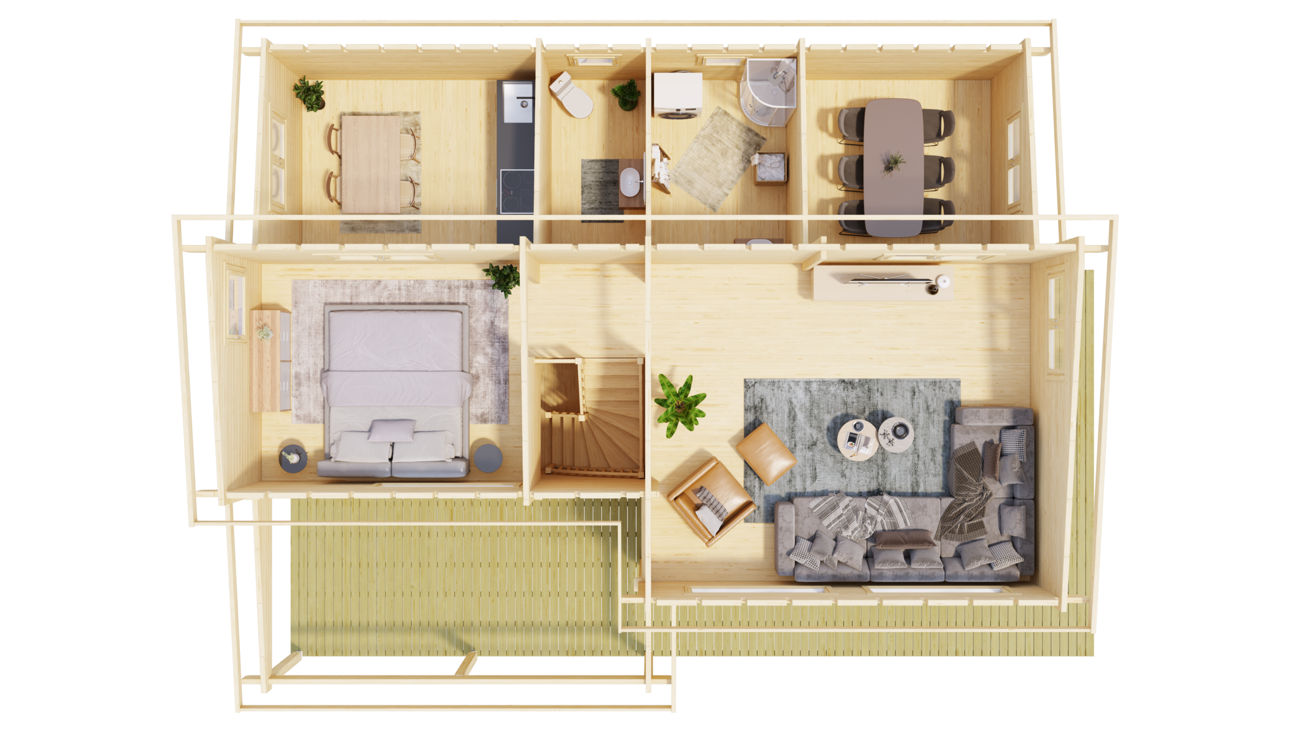 Ein Ferienhaus, das seinesgleichen sucht. Mekong sorgt mit viel Platz und Raum für pures Luxusfeeling. Auf 103,3 m2 lässt es sich nicht nur aushalten, sondern tatsächlich glamourös entspannen. Eine integrierte Treppe führt in das obere Stockwerk mit zwei separaten Räumen.