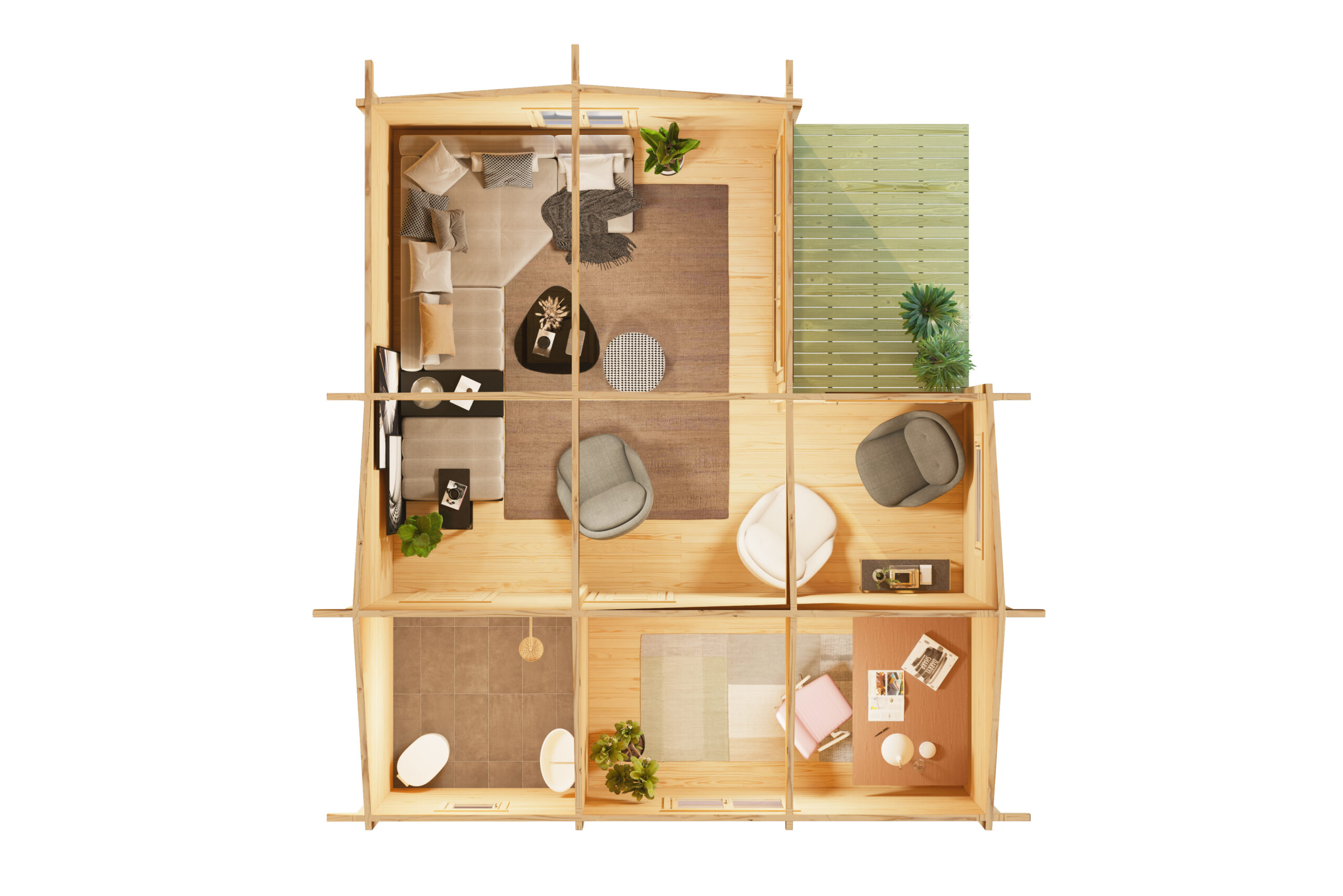 Ferienhaus mit Terrasse 92 mm , Fundamentmass 6600×7600, Naturbelassen