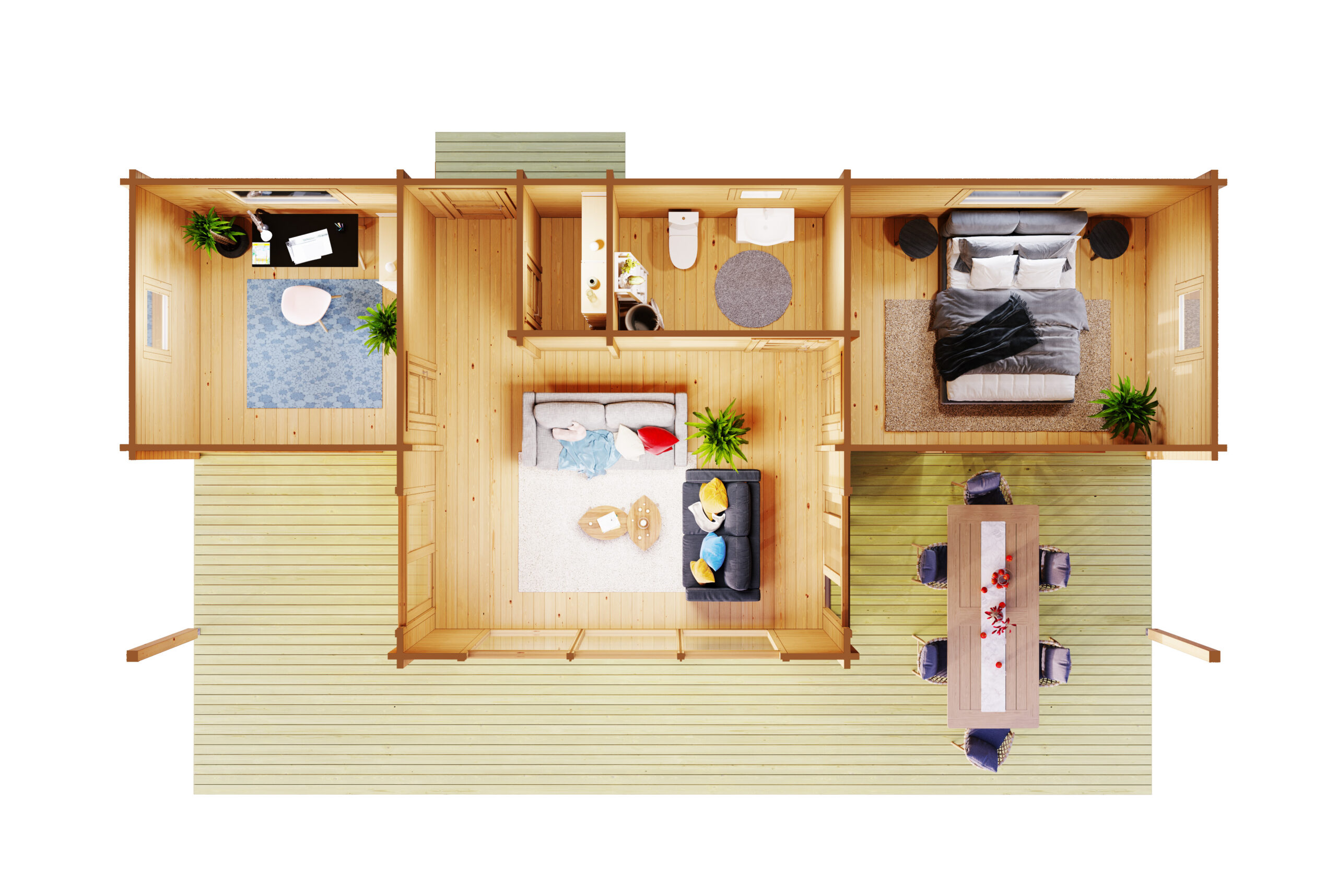Das hochmoderne Wochenendhaus mit 92 mm Wandstärke lässt Träume wahr werden: Auf 44,2 m2 Innenfläche und der Terrasse werden Wünsche erfüllt. Mit fünf separaten Räumen ist für jeden der passende Rückzugsort geschaffen. Die große Fensterfront mit Oberlichten sorgt für lichtdurchflutete Innenräume. Die integrierten Fenster lassen sich mittels komfortabler 1-Hand-Dreh-Kippsystematik öffnen und schließen.