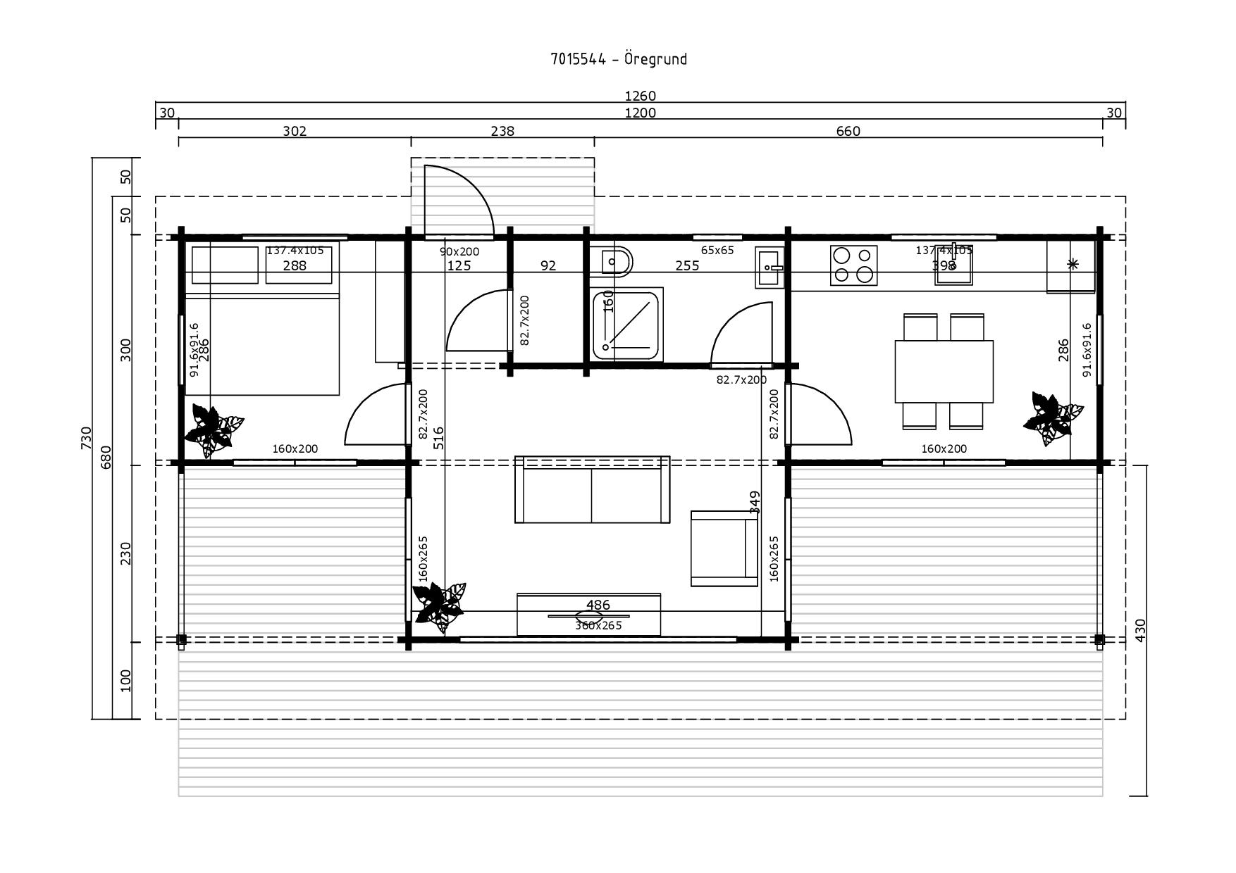 Ferienhaus mit 5 Räume und überdachten Terrasse 70 mm, Fundamentmass 5300×12000, Naturbelassen