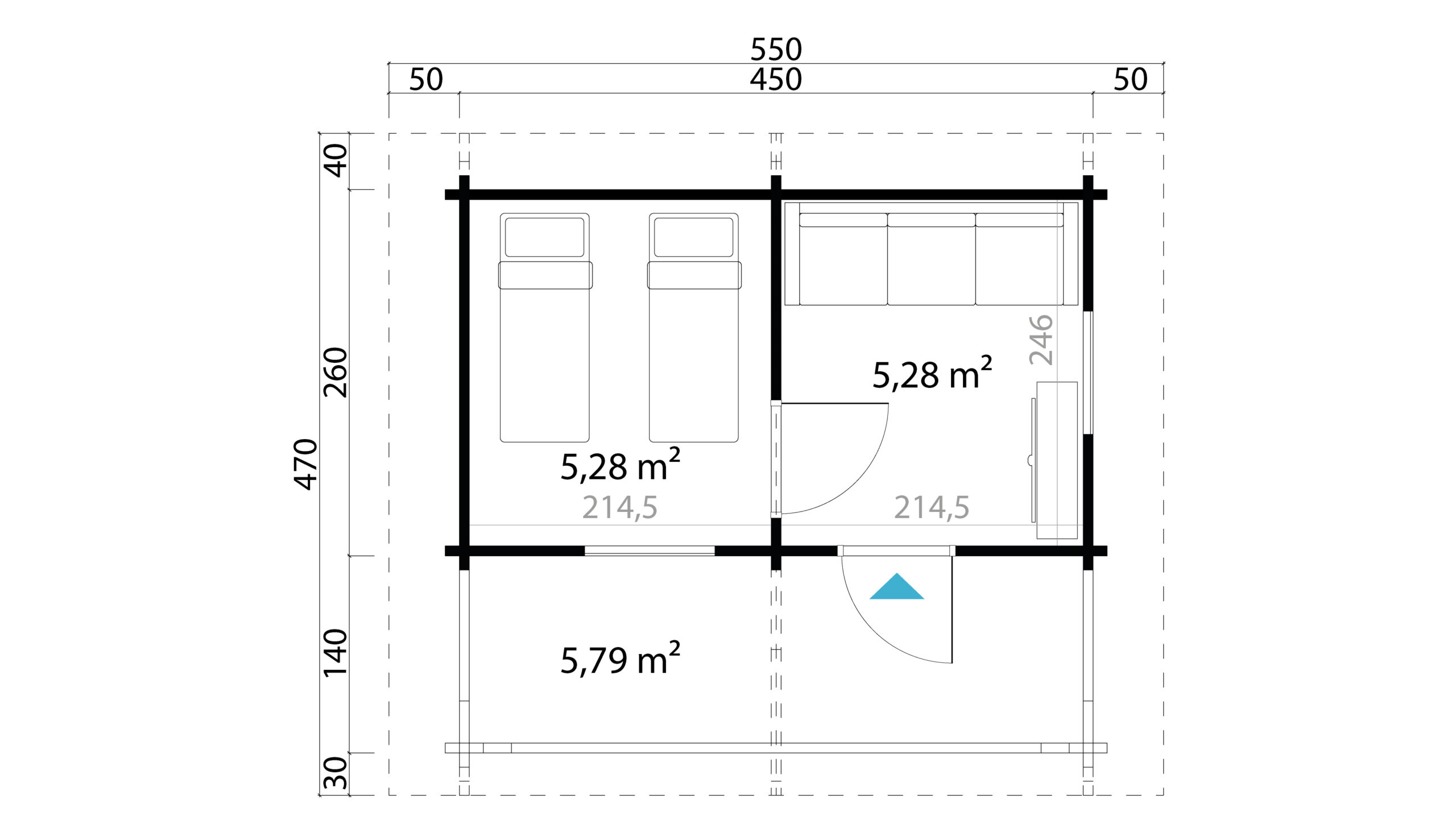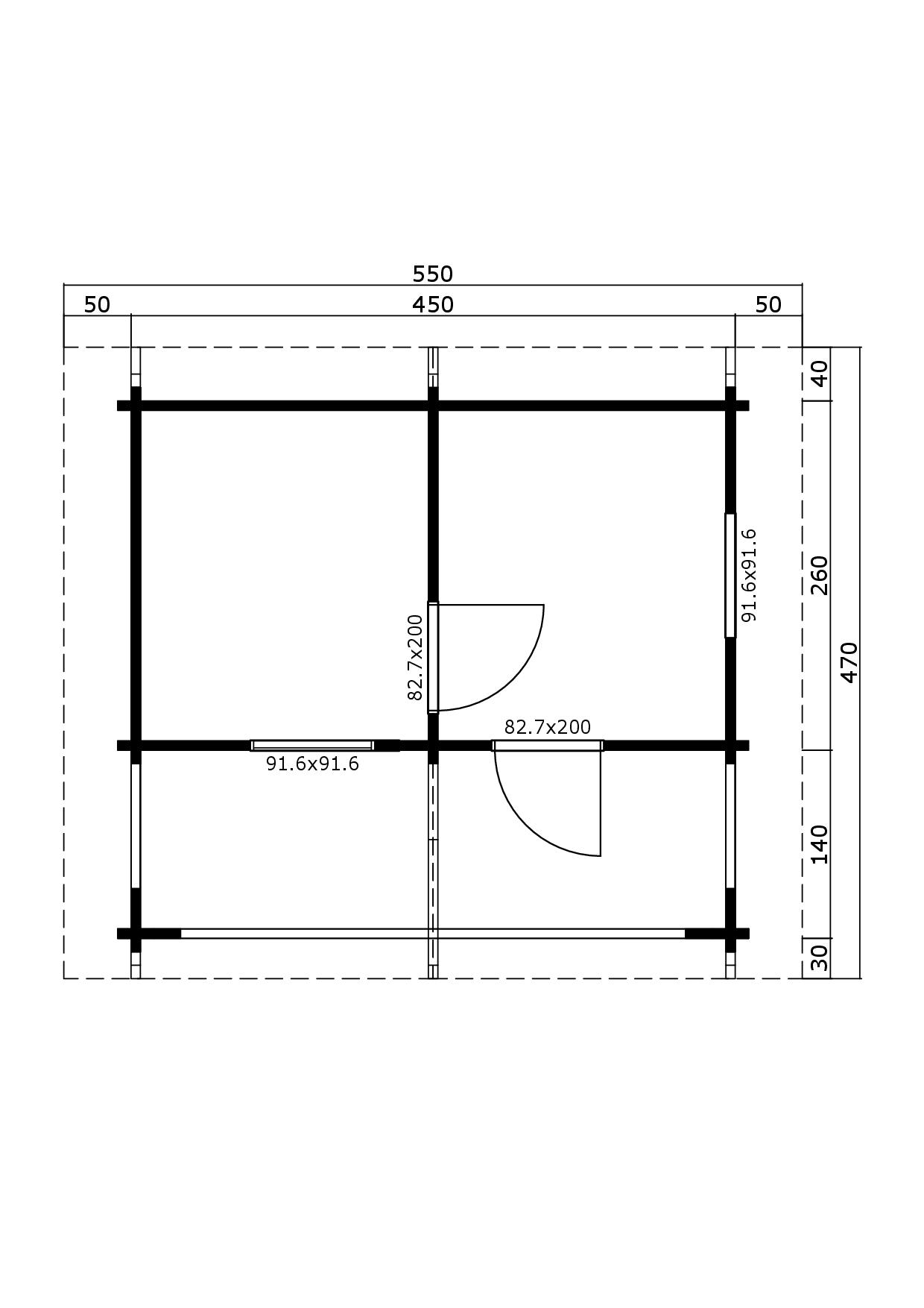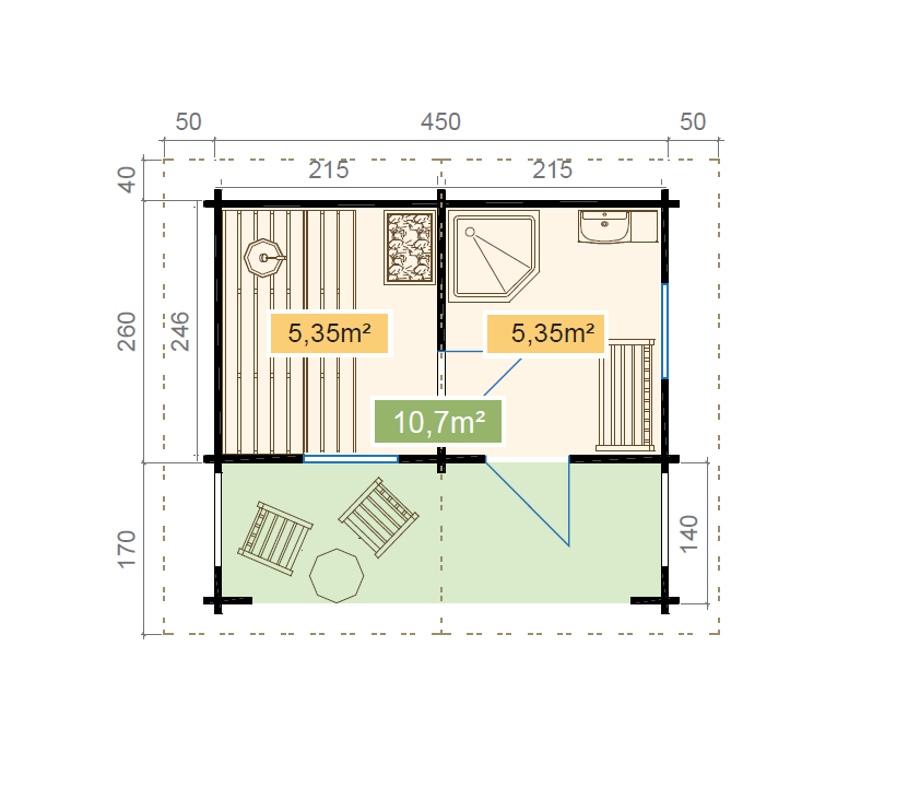 Ferienhaus mit 2 Räume und Terrasse 70 mm, Fundamentmass 4500×2600, Naturbelassen