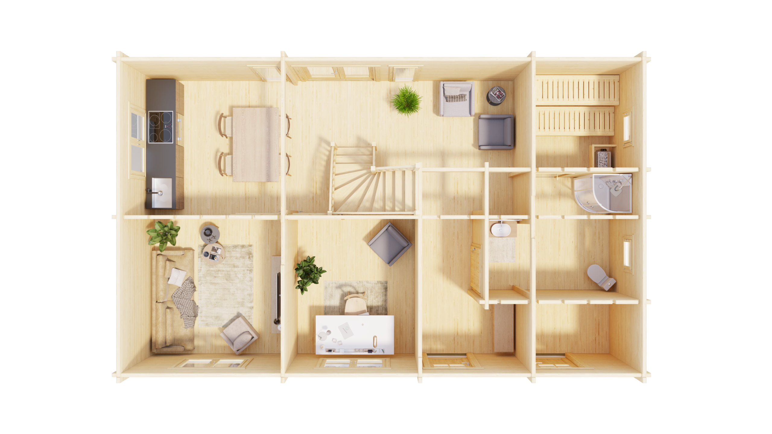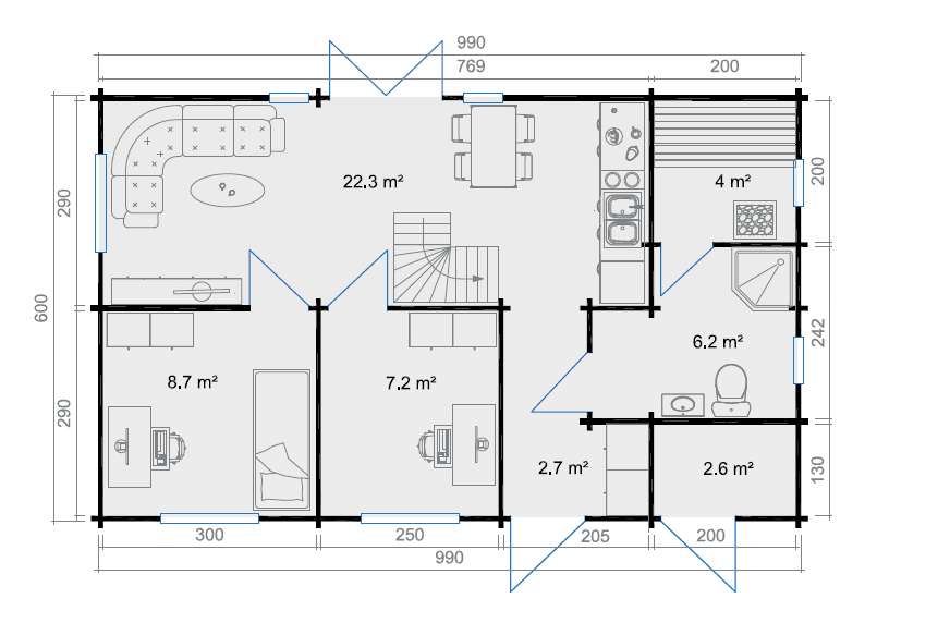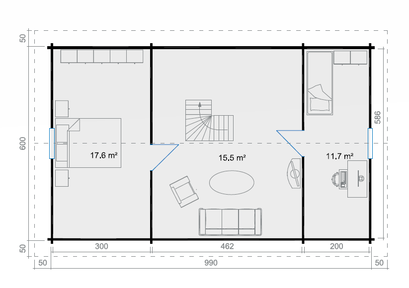 Der Traum vom eigenen Ferienhaus erfüllt sich mit Värnamo: 98,5 m2 Wohnfläche verteilt auf vier separate Räume – mit einer Wandstärke von 70 mm bietet das Haus alles, was das Herz begehrt. Zudem sorgen separate Eingänge für viel Privatsphäre. Eine Treppe führt ins obere Loft-Stockwerk. Hier kann man gemütlich die Seele baumeln lassen und die freien Tage im Grünen genießen. Die integrierten Fenster lassen sich mittels komfortabler 1-Hand-Dreh-Kippsystematik öffnen und schließen.