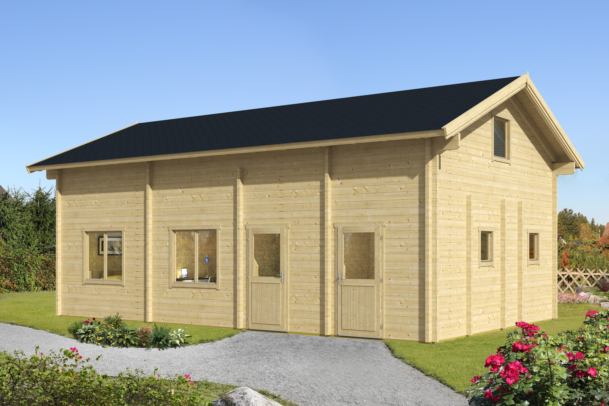 Genießen Sie die Vorteile unserer hochwertigen Doppelverglasung ohne Aufpreis! Bei allen Holzbauten mit einer Wandstärke von mindestens 34 mm erhalten Sie automatisch doppelverglaste Fenster und Türen.