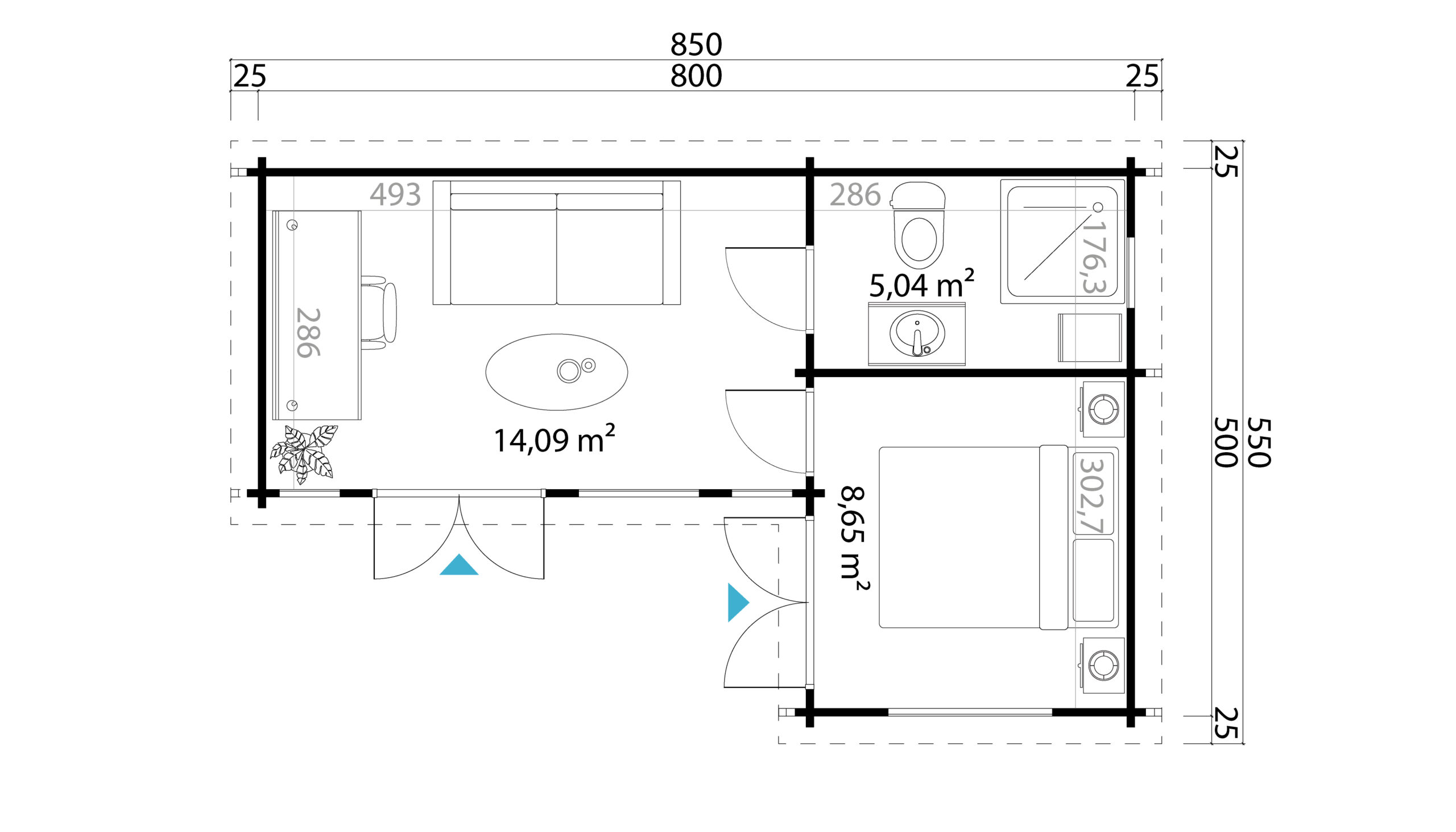 Um die Ecke gedacht: Das schmucke Häuschen Varberg mit modernem Flachdach wartet mit 27,8 m2 Fläche auf, die sich auf drei separate Räume verteilen. Ein gemütliches Wohnzimmer, ein Bad und ein Schlafbereich finden hier bequem Platz. In dieser Platinausführung ist eine Premiumtür mit einem Isolierwert von 3,0 inklusive. Damit ist dieses kompakte Haus auch für kühlere Tage bestens geeignet.