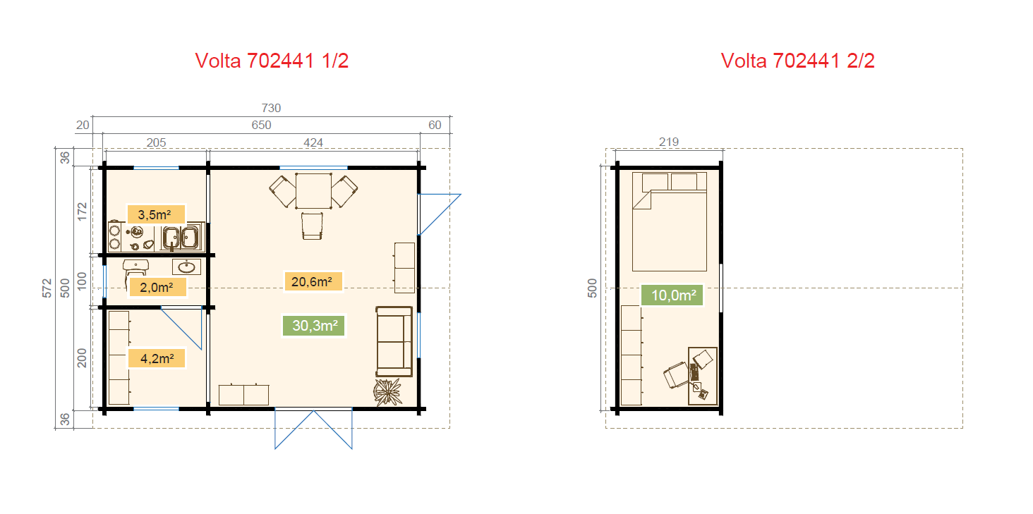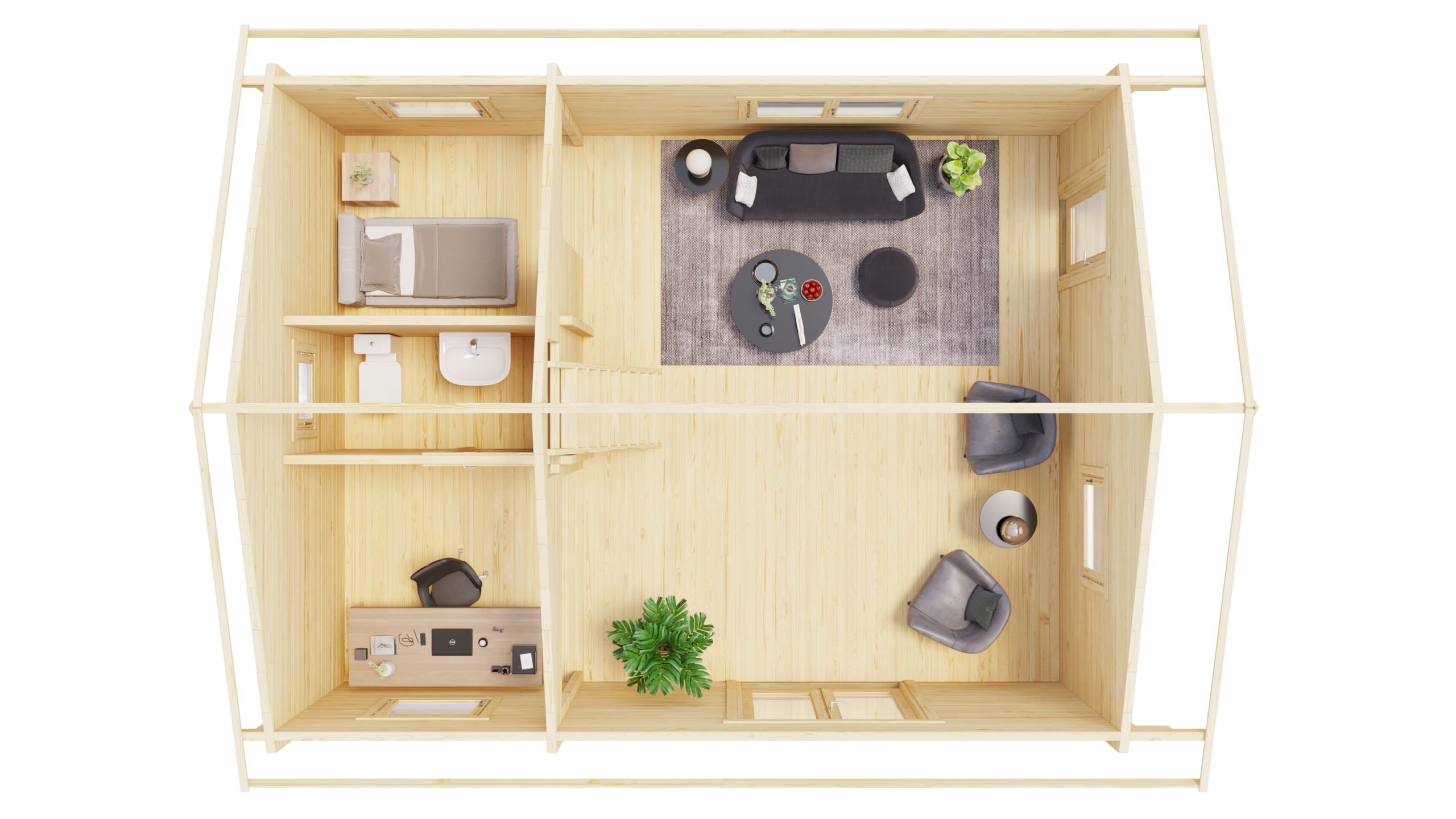 Volta ist der Urlaubsort für große und kleine Abenteurer. In dem großen Wohnraum kommen alle zusammen und genießen die gemeinsame Zeit. Eine Leiter führt auf die obere Loftebene zum Schlaf- bzw. Lagerboden, wo man die Seele baumeln lassen und zur Ruhe kommen kann. Das klassische Modell mit 40,2 m2 bietet mit seiner großen Terrasse noch einmal extra Raum zum Spielen, Toben und Entspannen. Auch die zusätzlichen kleinen Räume können Sie ganz nach Ihren Vorstellungen gestalten.