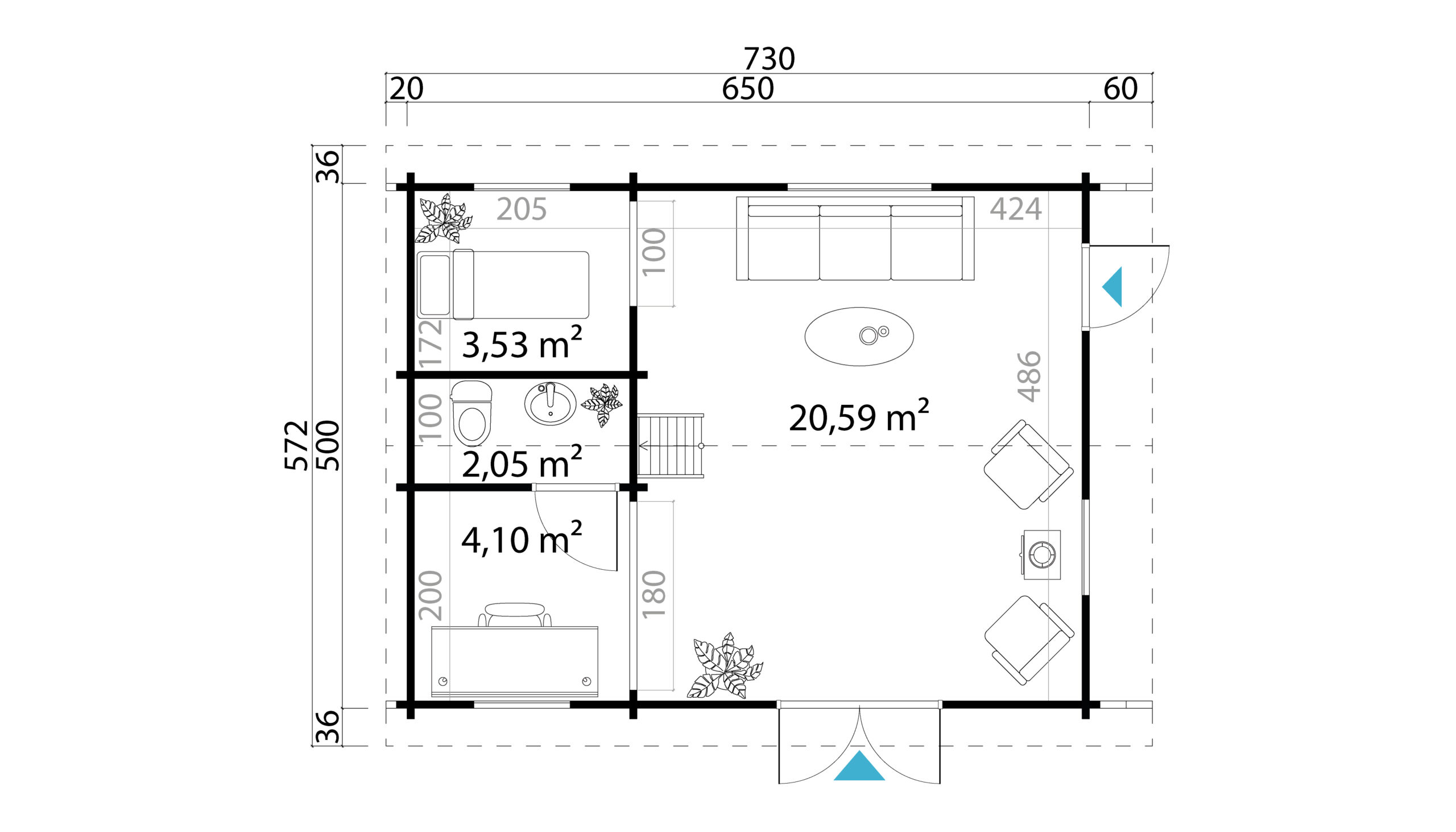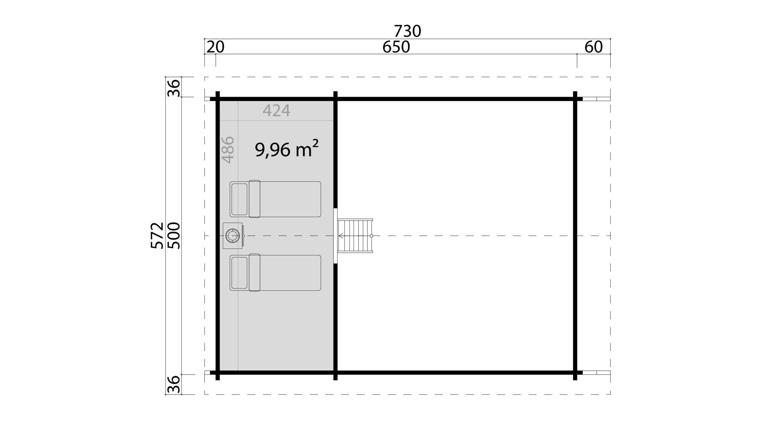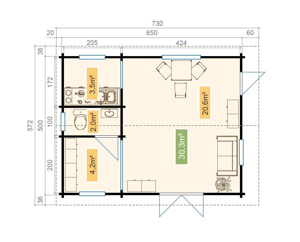 Ferienhaus mit 5 Räume 70 mm, Fundamentmass 5000×6500, Naturbelassen