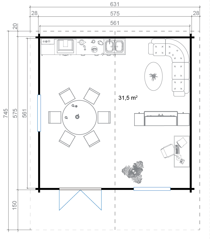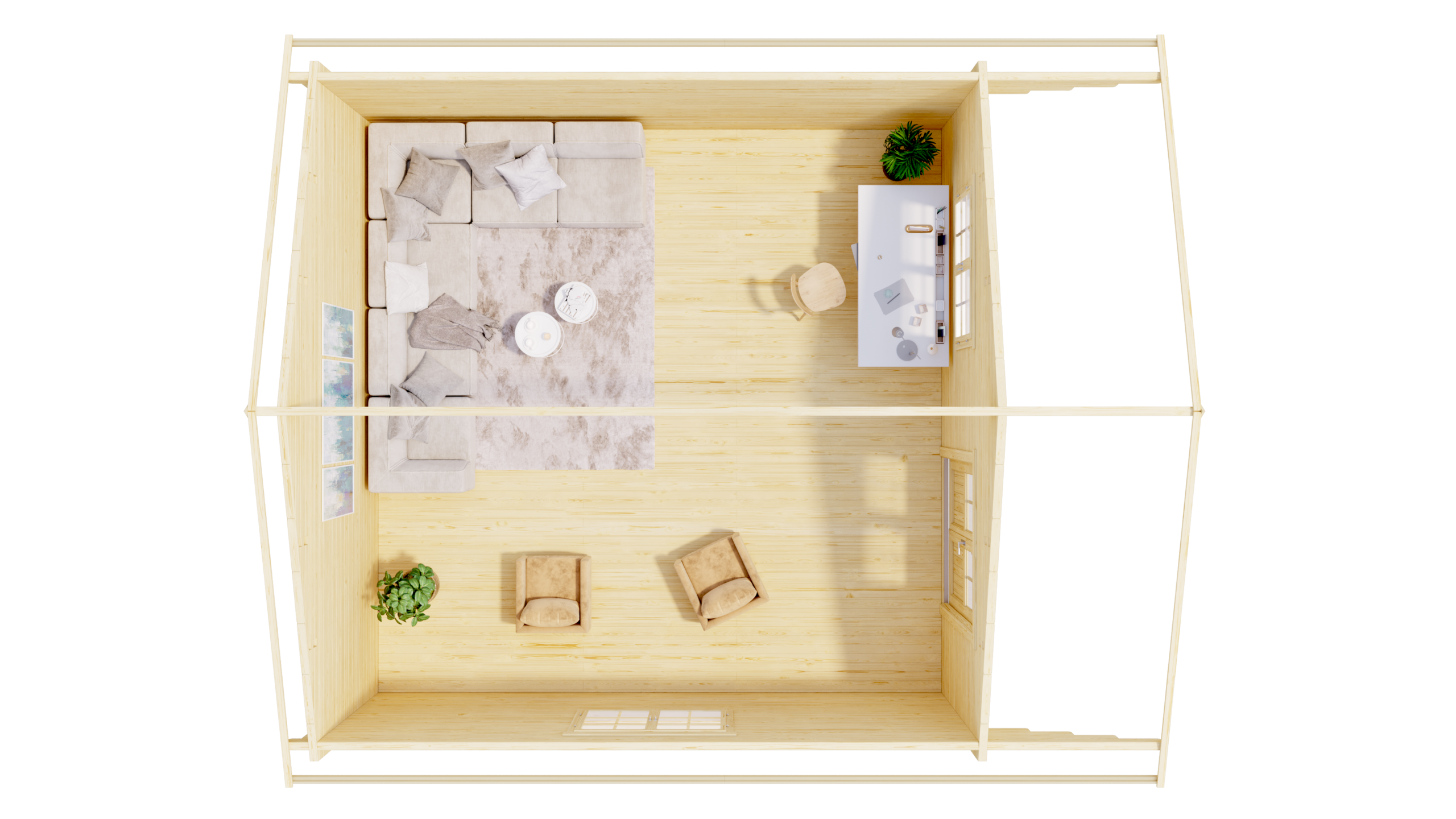 Wer den Blockbohlenstil liebt, ist bei Zanzibar genau richtig: Der moderne Klassiker aus robuster nordischer Fichte lädt auf 31,5 m2 Innenfläche zum gemütlichen Verweilen ein. Durch die breite Doppeltür wird der geräumige Wohnraum noch einmal nach draußen vergrößert. Den Duft von frischem Sommerregen kann man unter dem extra langen Vordach genießen.