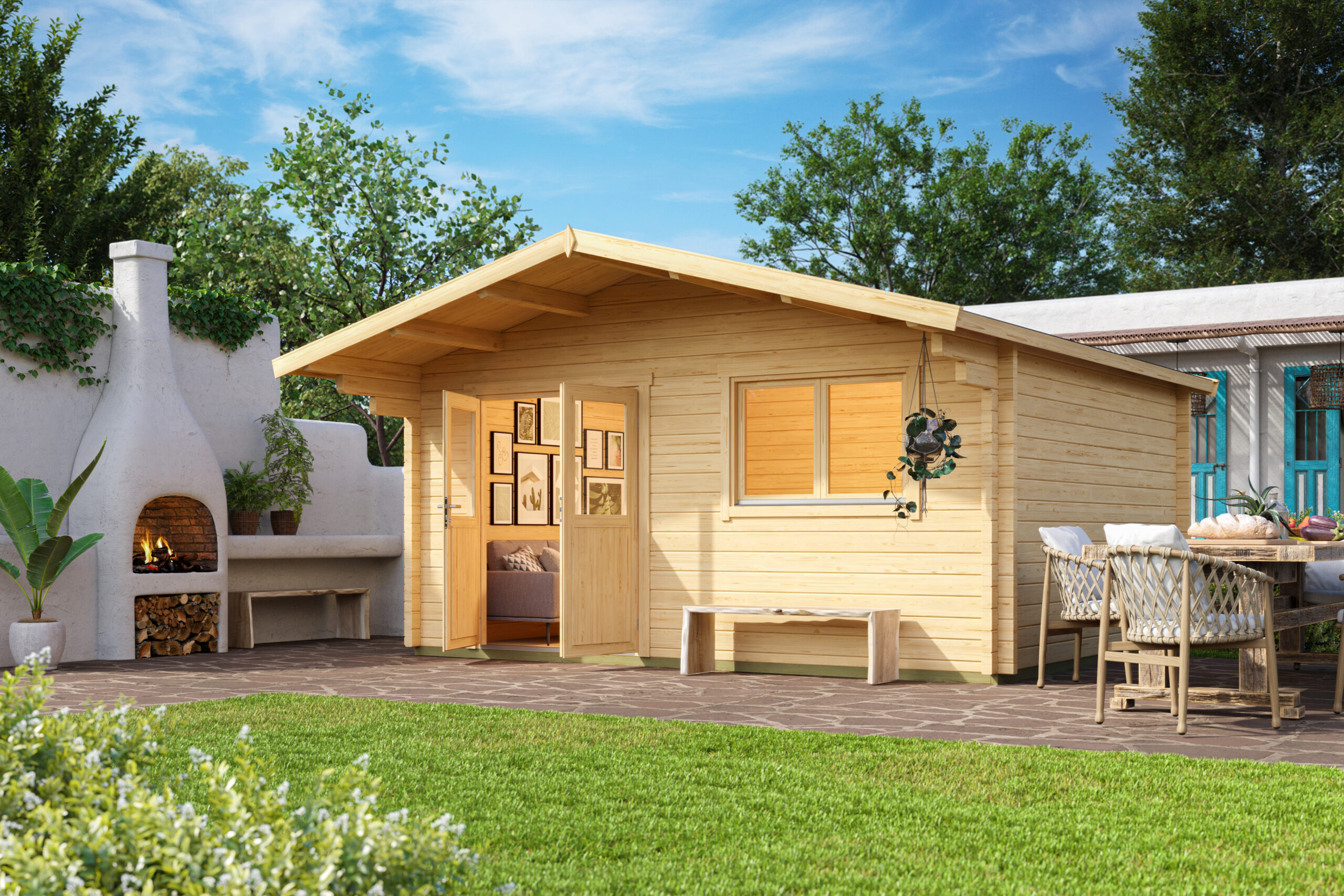 € 6399,79Ferienhaus mit Vordach 70 mm, Fundamentmass 3900×3900, Naturbelassen