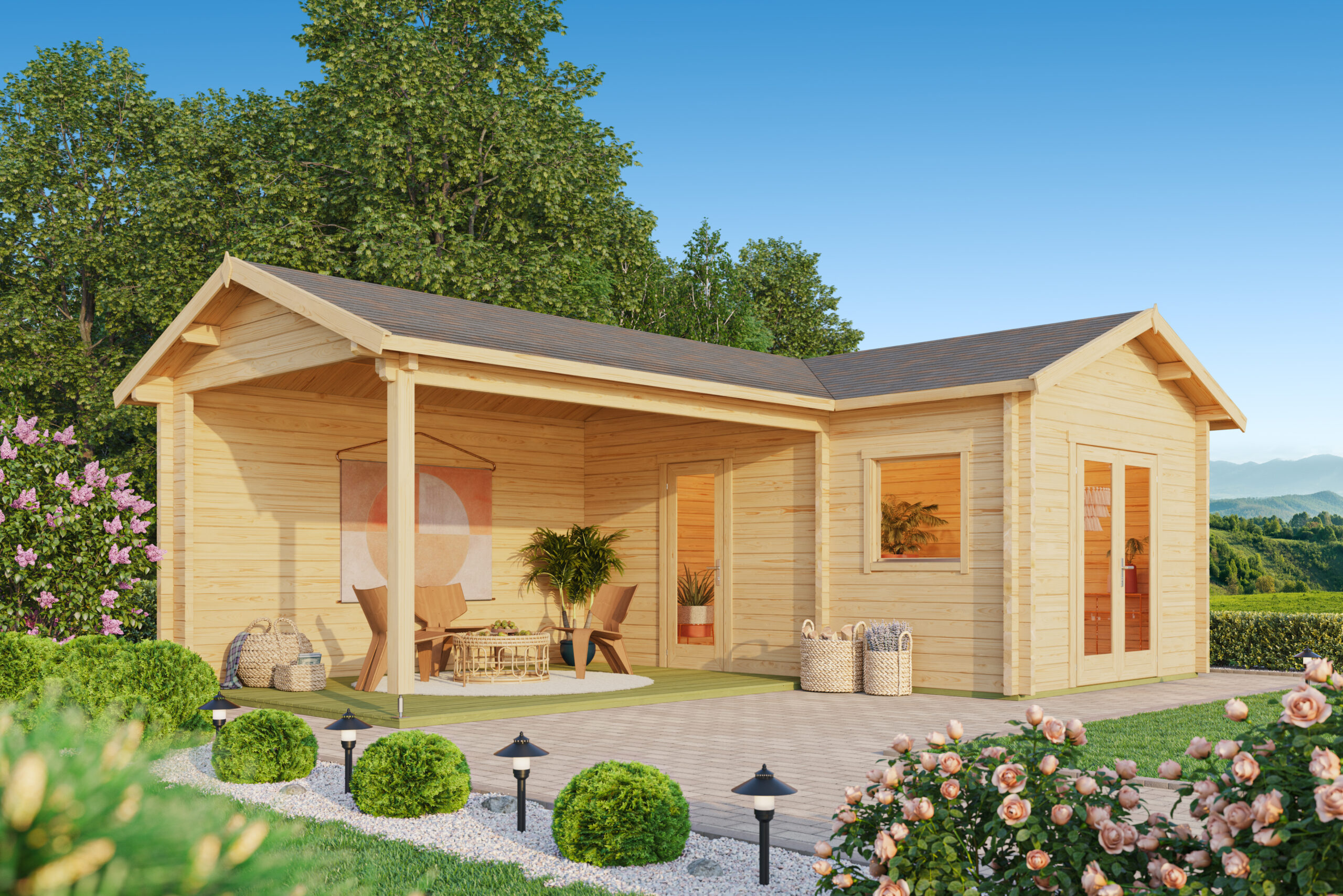 € 11590,99Ferienhaus mit überdachten Terrasse 70 mm, Fundamentmass 4300×3200, Naturbelassen