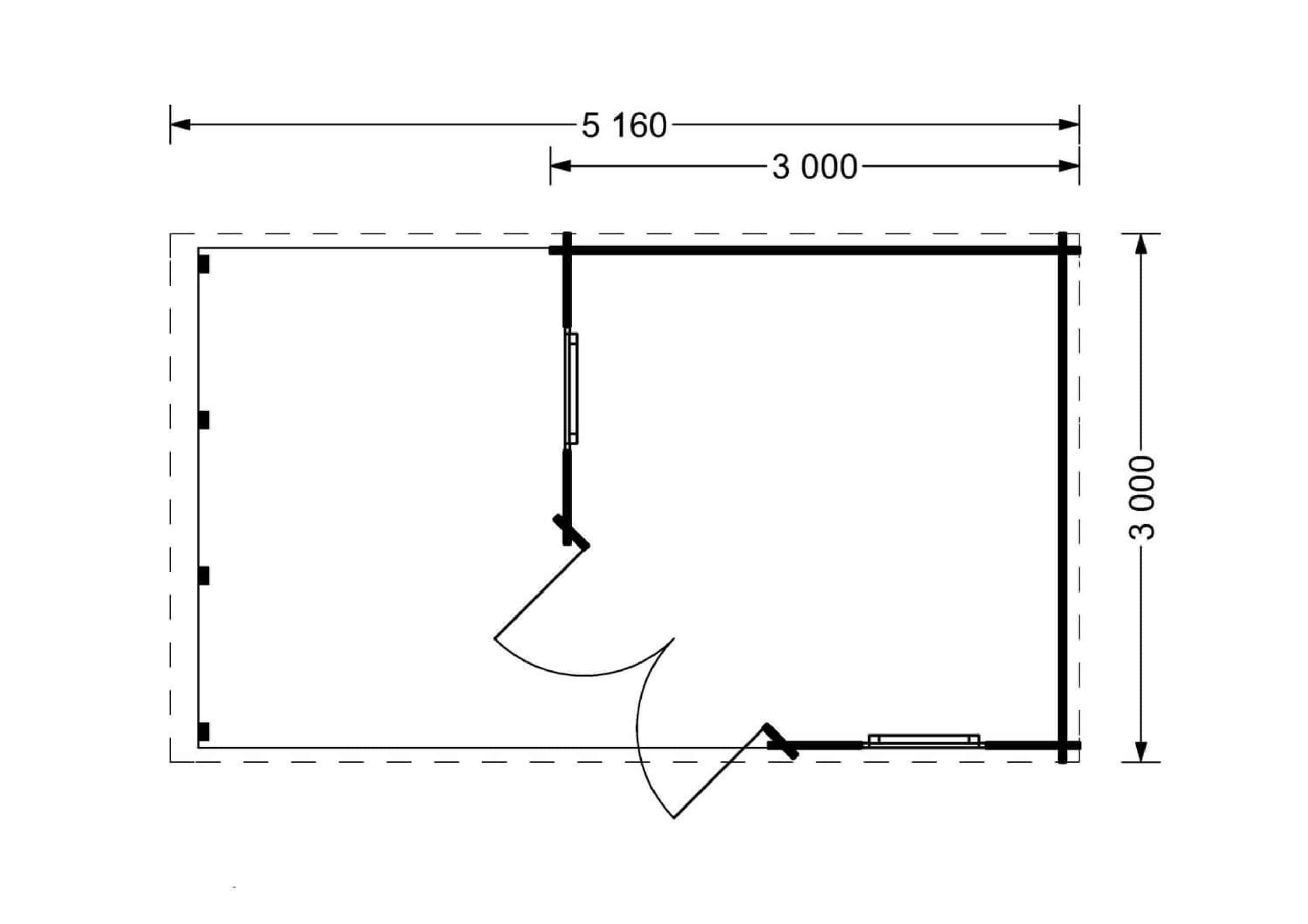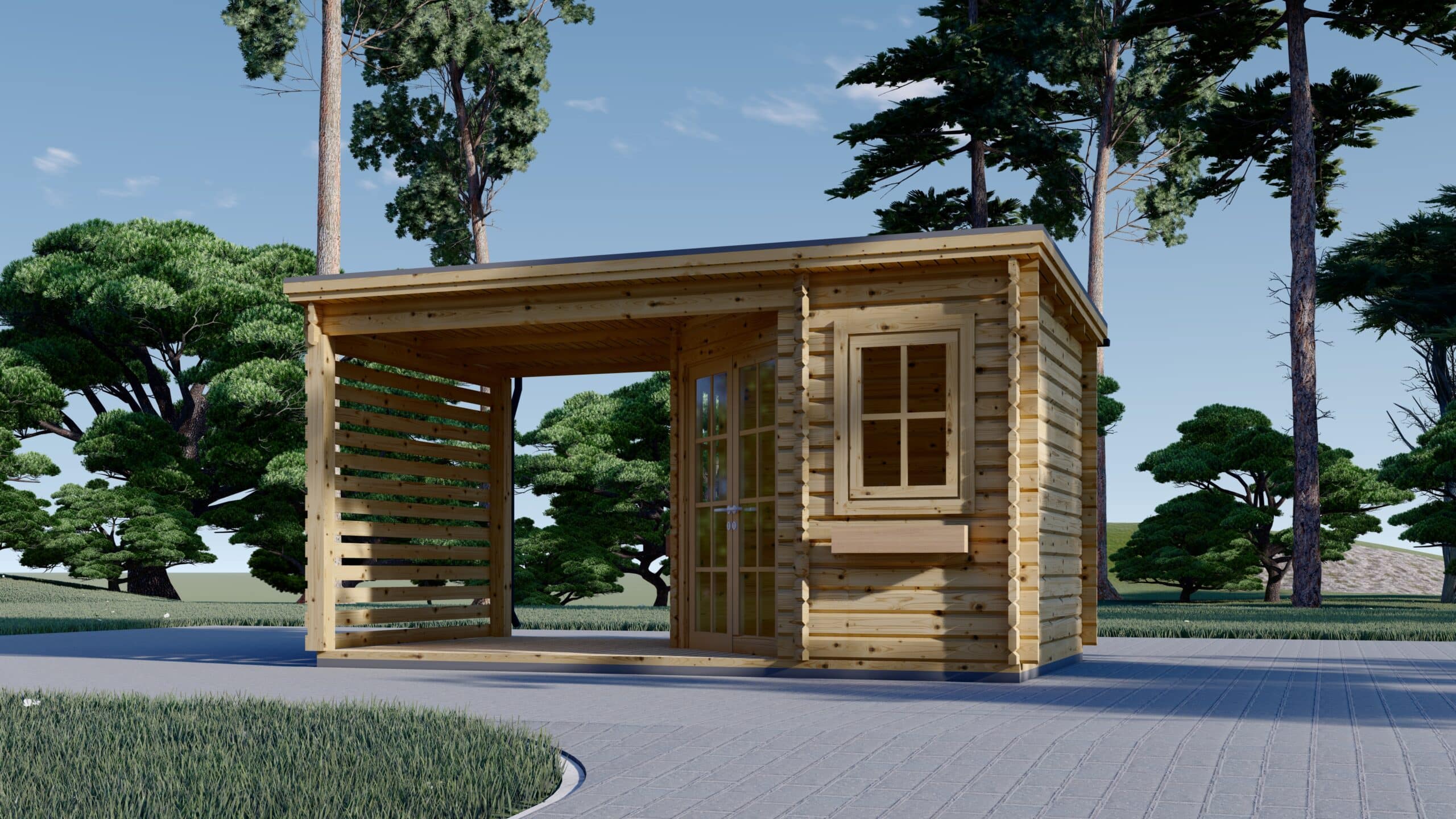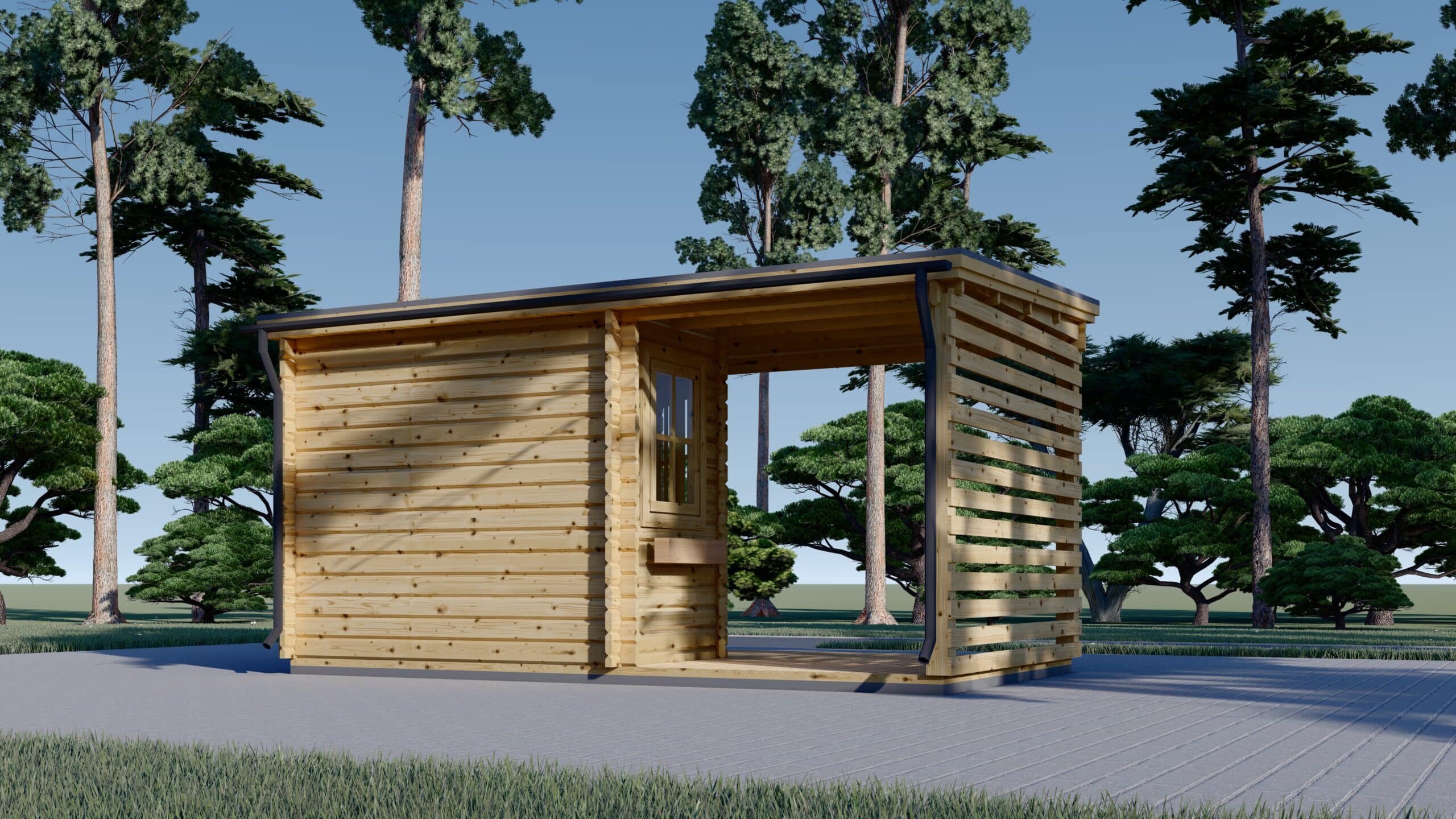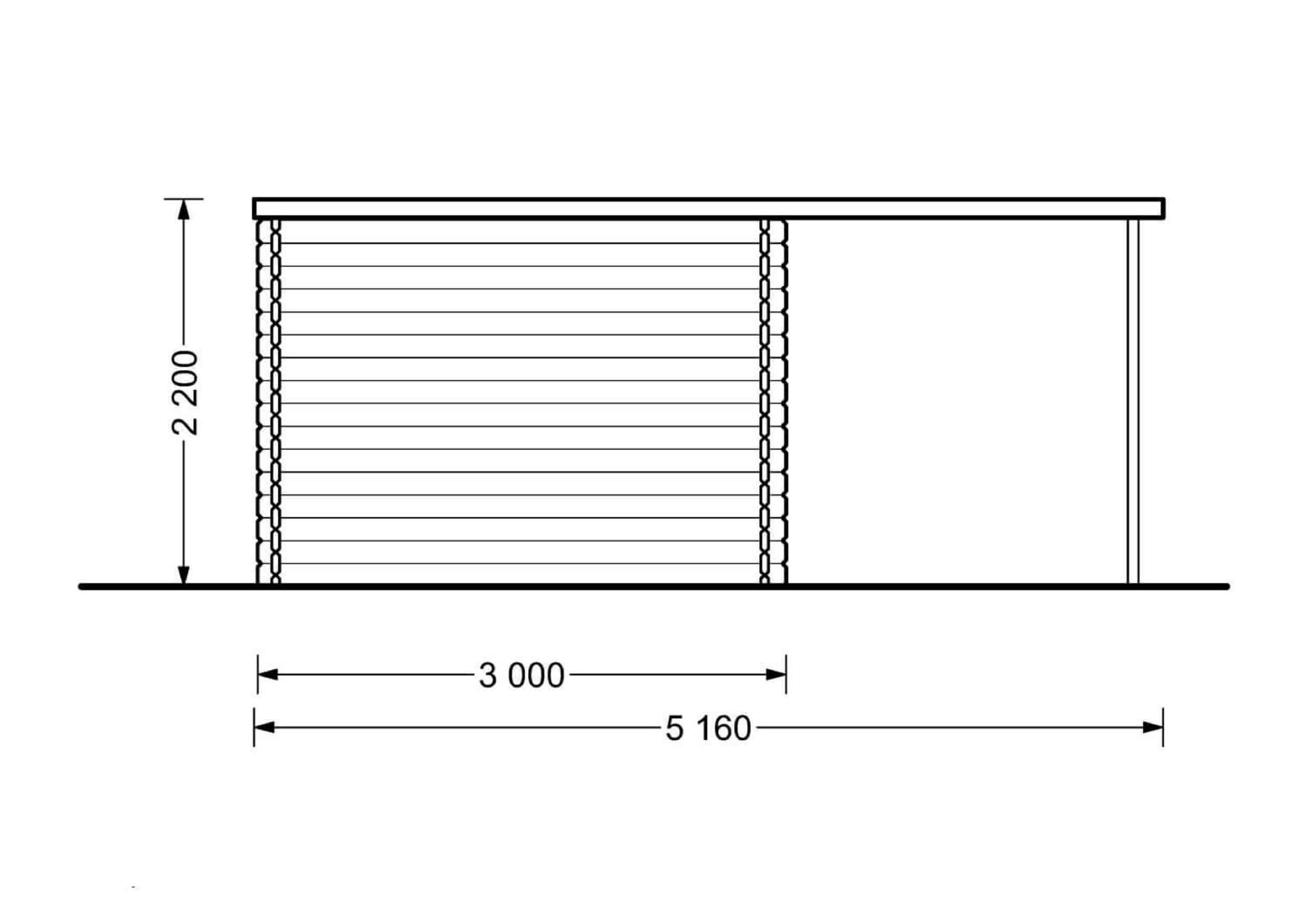 Das Gartenhaus ALAN PLUS mit einer Wandstärke von 28mm und einer Größe von 5x3m bietet eine Fläche von 9m² im Hauptbereich und zusätzlich 6.5m² an überdachter Fläche.