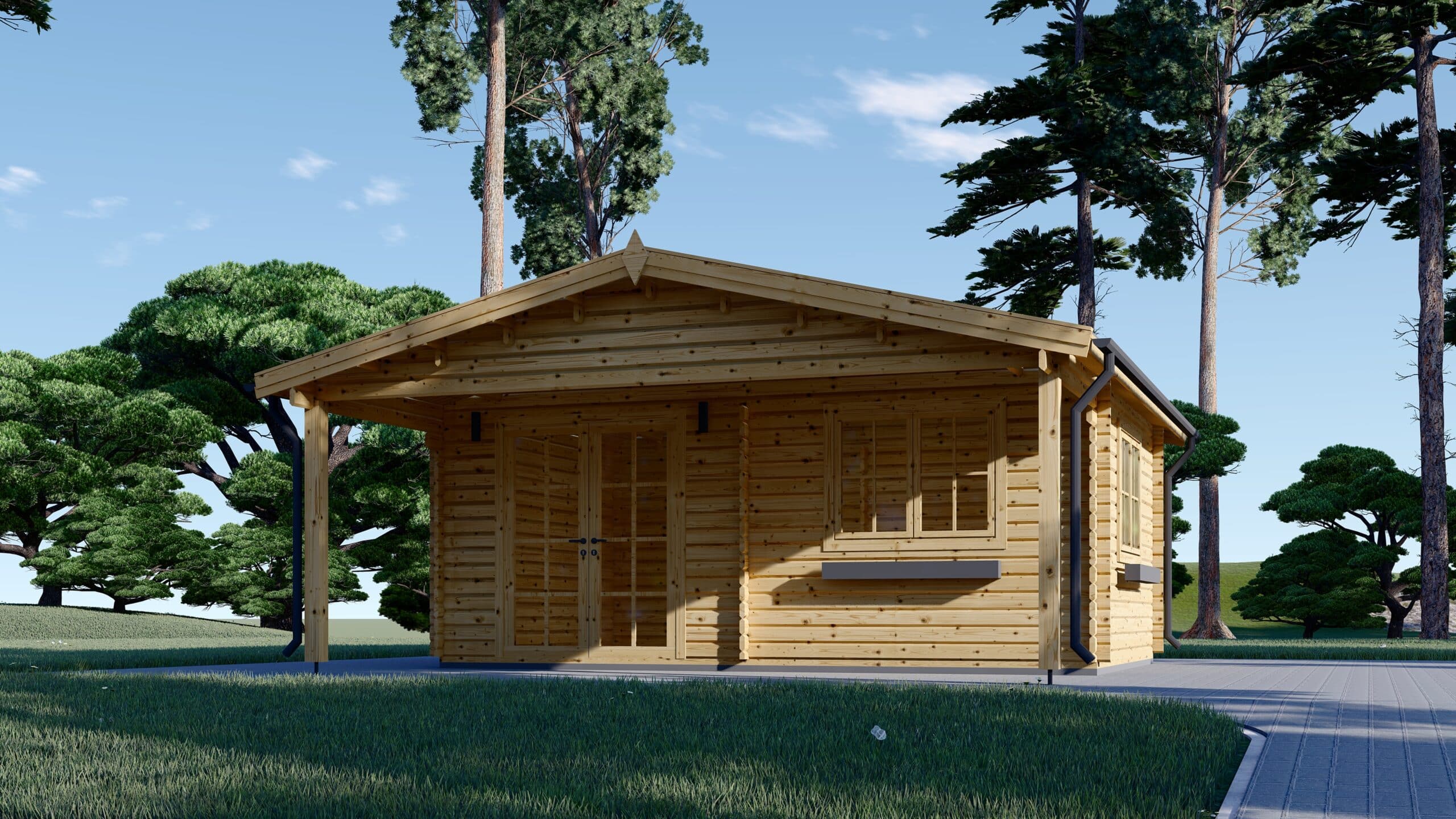 Premium Gartenhaus „Camila“ (34, 44 oder 66 mm), 6×6 m, mit 11 m² großer Terrasse und großem Vordach