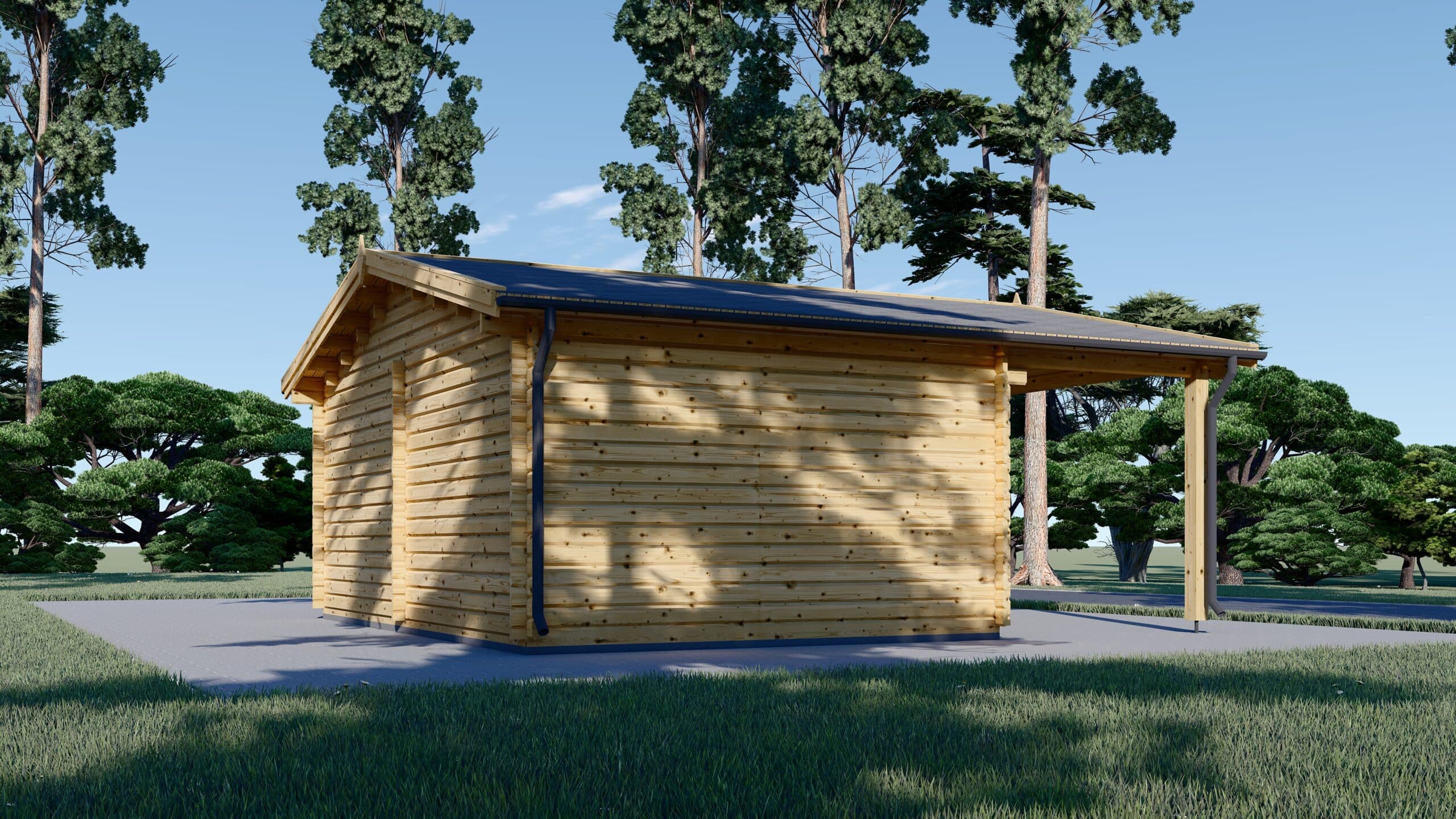 Der stilvolle Dachüberstand erweitert Ihren Außenbereich und bietet einen zusätzlichen schattigen Bereich an den Seiten der Hütte. Perfekt, um eine Bank darunter zu stellen und die Natur zu genießen.