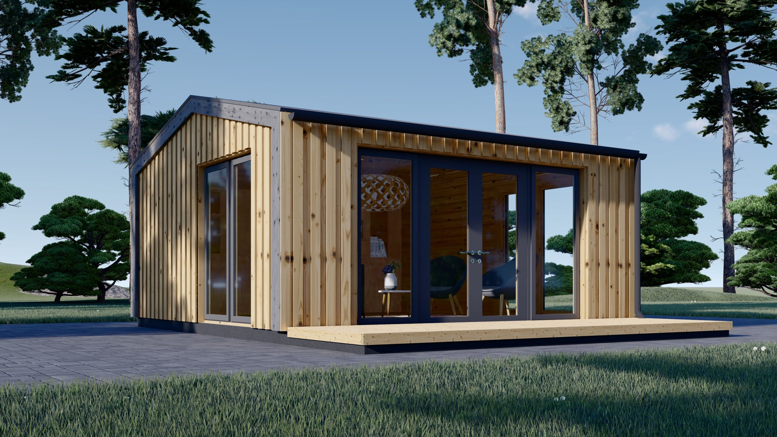 Genießen Sie die Natur noch intensiver, indem Sie ERMONES mit einer optionalen stilvollen Außenterrasse erweitern. Dies bietet Ihnen zusätzlichen Platz im Freien zum Entspannen und Verweilen – der perfekte Ort, um die Schönheit des Gartens zu erleben.