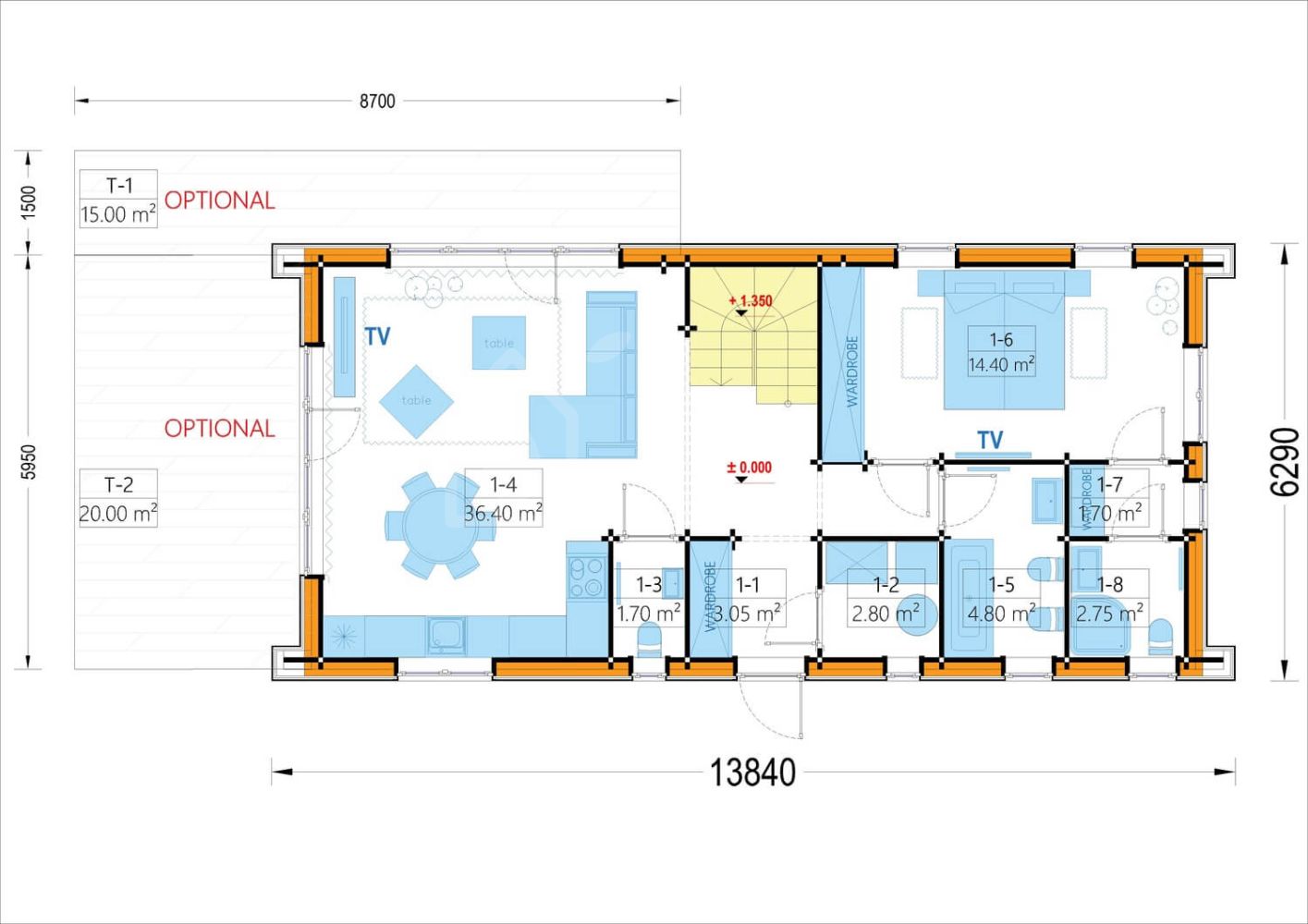 Holzhaus ALPINA(66 mm + Holzverschalung Isoliert ), 120 m²