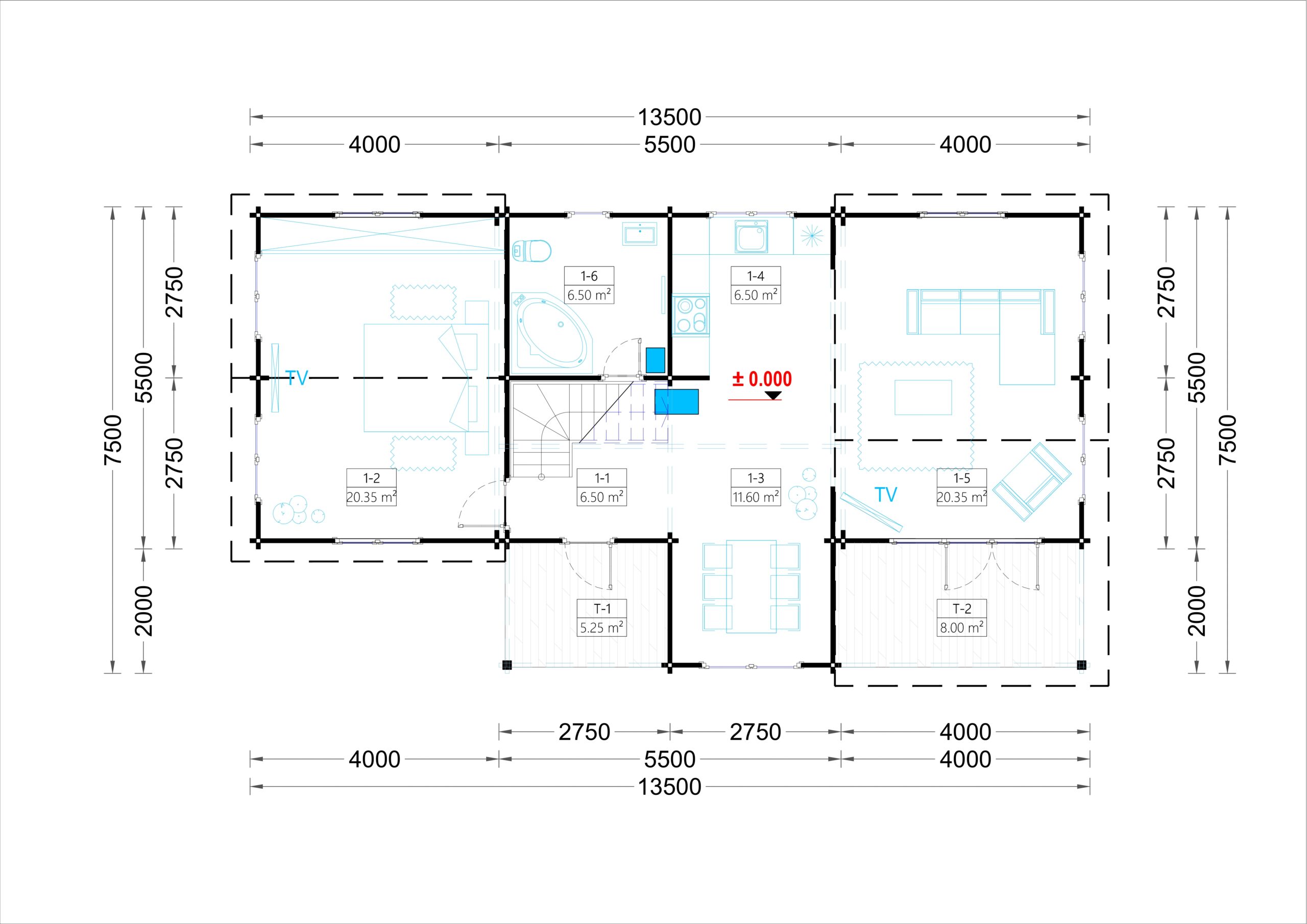 • Professionelle, hochwertige PVC-Fenster und -Türen. • Wärmewiderstandskennwerte und Dämmstärke der Wände, des Daches uns der Boden . • Zusätzliche Dachbelastung (kann Solarpaneele halten, höhere Schneebelastung ermöglichen). Ab einer Wandstärke von 66 mm, ist das Dachdecken mit Dachsteinen, Dachziegeln möglich. Das elegante und geräumige Holzhaus DACHSTEIN, das von der niederländischen Architektur inspiriert wurde, verkörpert das ideale Zuhause für eine Familie. Es bietet ein ausgewogenes Verhältnis zwischen offenen Räumen, die eine einfache Kommunikation mit Ihren Lieben ermöglichen und individuellen Zimmern, die allen ihre Privatsphäre garantieren. Gestalten Sie den Wohnraum so, wie Sie es bevorzugen – genießen Sie viele, offene Flächen, größere Räume oder schaffen Sie sich kompaktere und gemütlichere Bereiche – die Möglichkeiten dieses Modells sind wahrlich vielfältig.