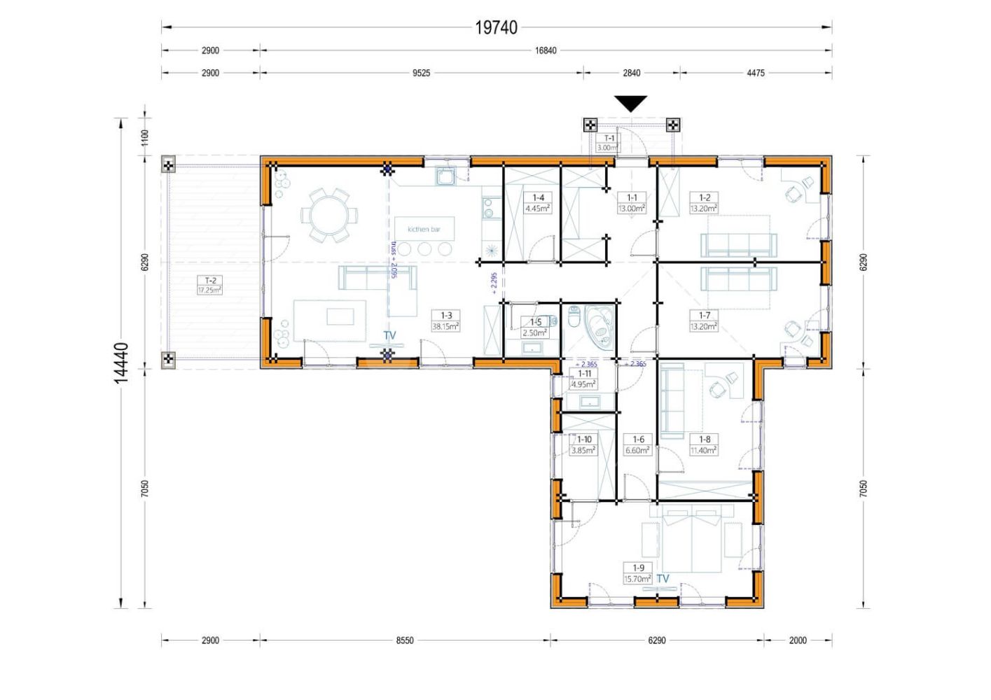 Mit einem praktischen und ästhetischen L-förmigen Grundriss ist Holzhaus TAUERN ein Meisterwerk des modernen Designs. Die großzügige überdachte Terrasse bietet nicht nur Platz zum Entspannen im Freien, sondern ist auch direkt vom Wohnzimmer aus zugänglich. Wenn Sie mehr Platz wünschen, können Sie die Terrasse optional und gegen Aufpreis erweitern.