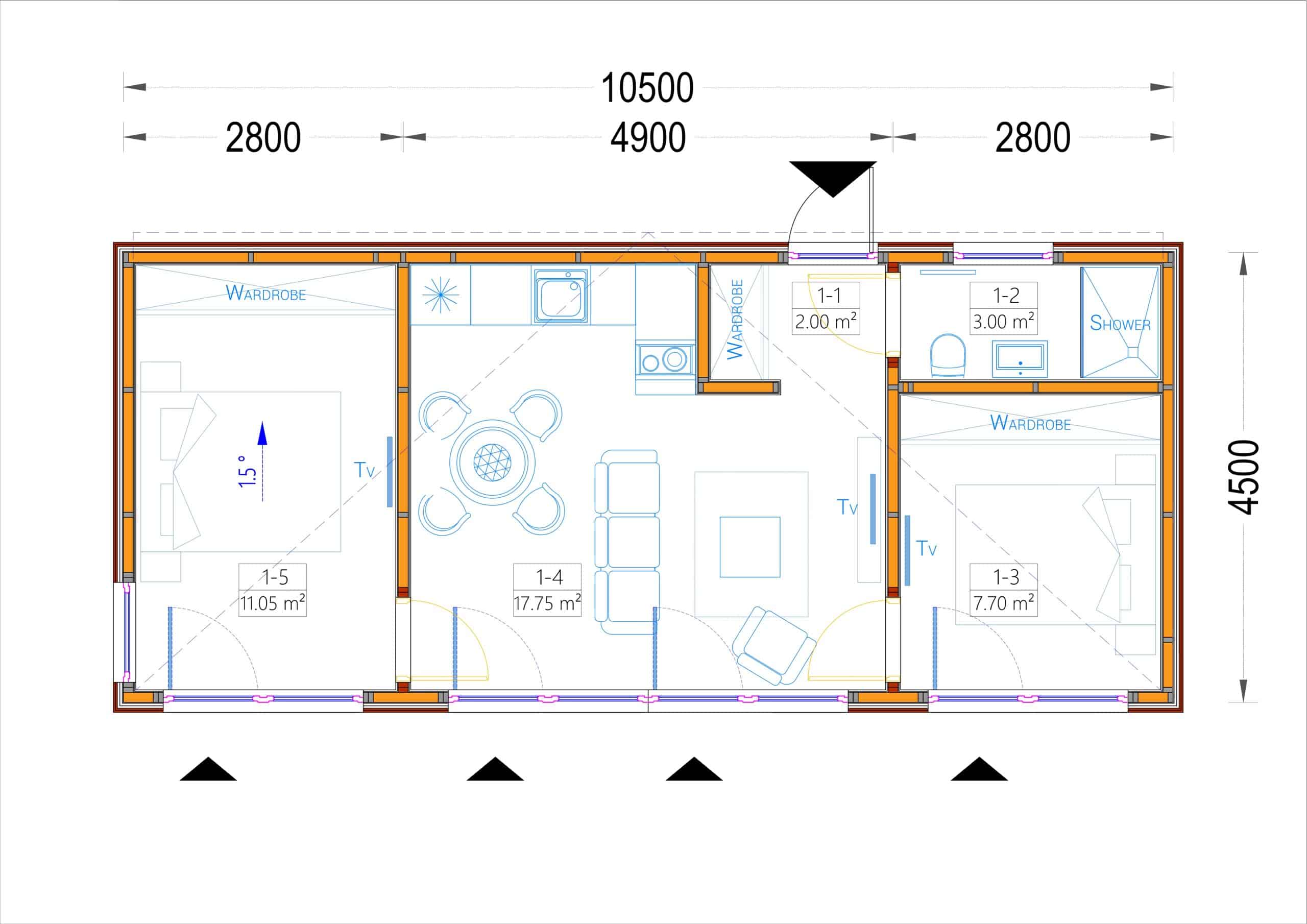 • Hochwertige Dämmstoffe, darunter 124 mm dicke Wände (Strukturelle Isolierplatten), 174 mm starkes Dach und 100 mm XPS-Dämmung für die Fußböden, gewährleisten eine effiziente Wärmedämmung.