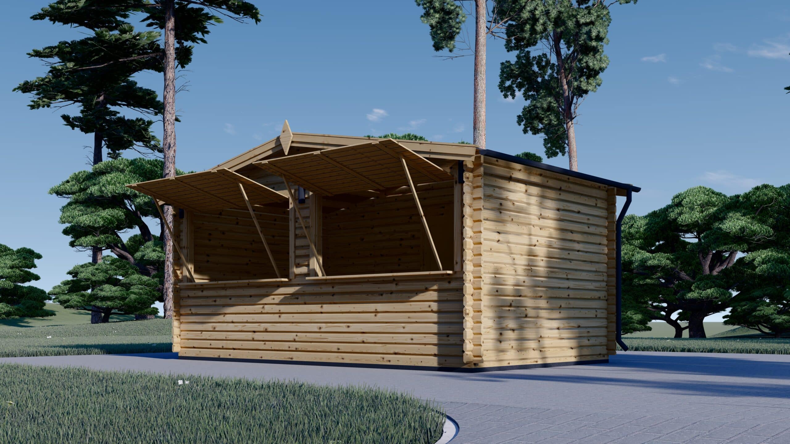 Dieser Holzkiosk bietet die Möglichkeit, einen eigenen Verkaufsstand zu besitzen oder Ihr Geschäft zu bewerben. Die flexible Gestaltung ermöglicht es, den Kiosk nach Ihren Wünschen anzupassen und vielseitig zu nutzen. Mit diesem Modell schaffen Sie eine attraktive Präsentationsfläche für Ihre Waren oder Dienstleistungen.